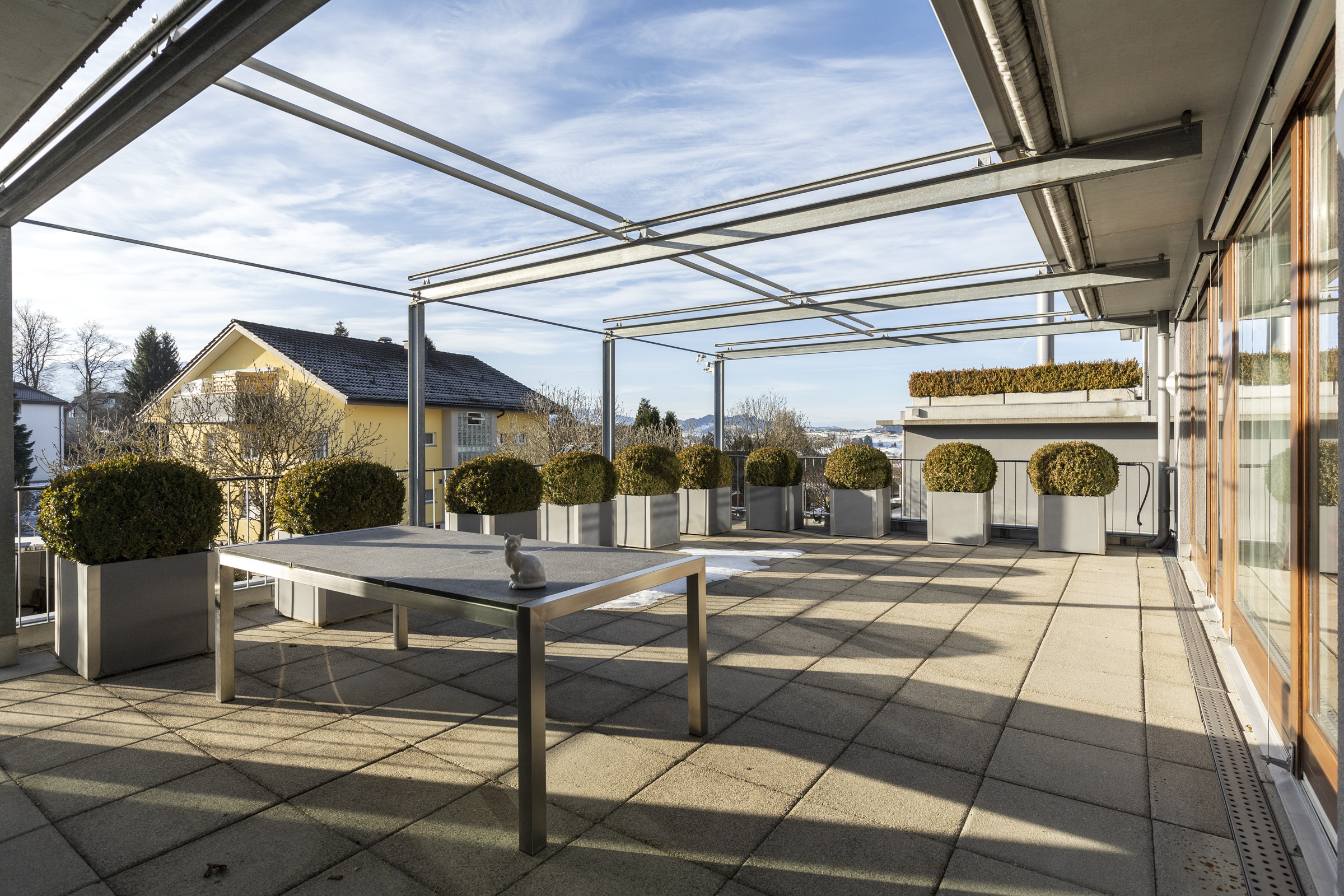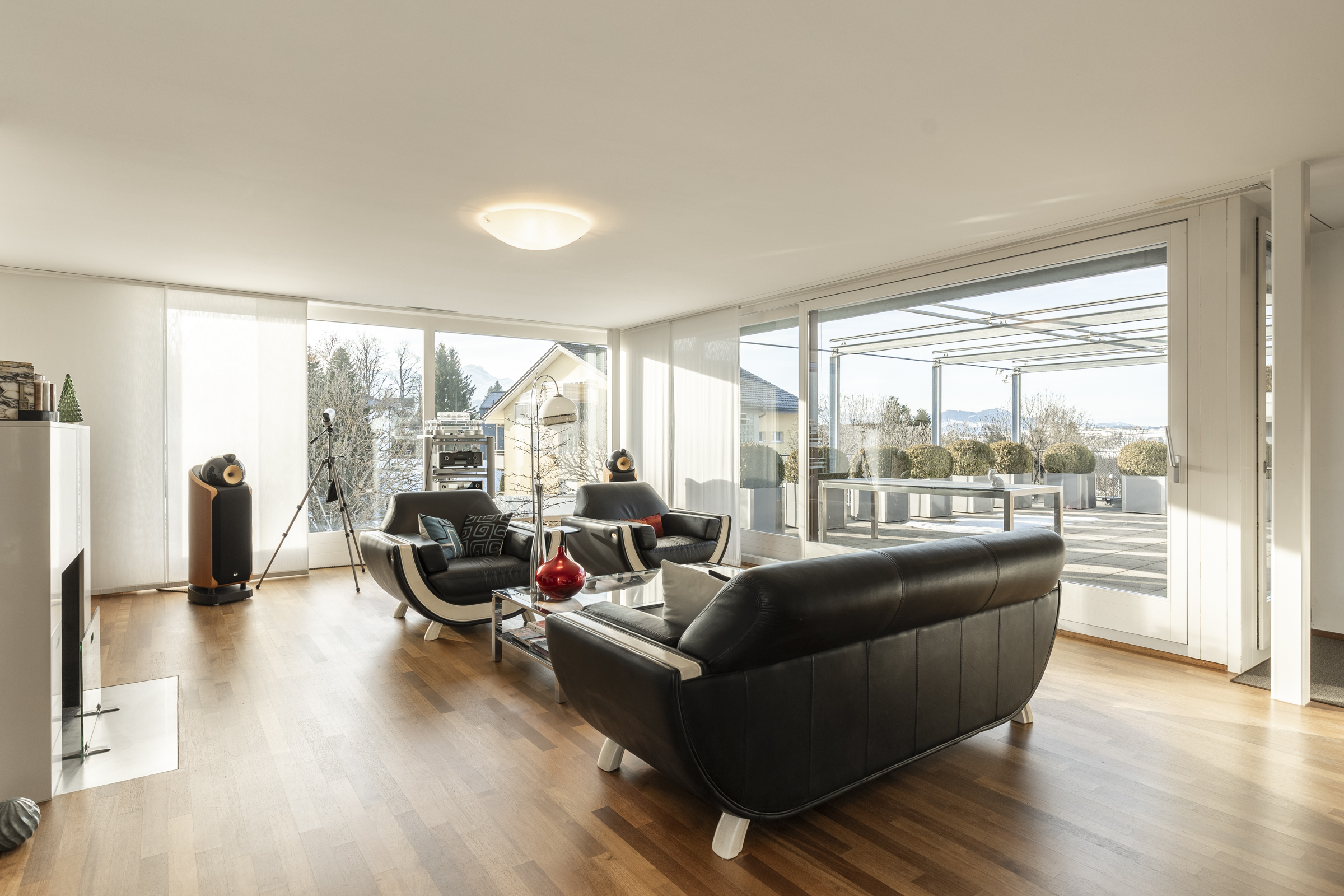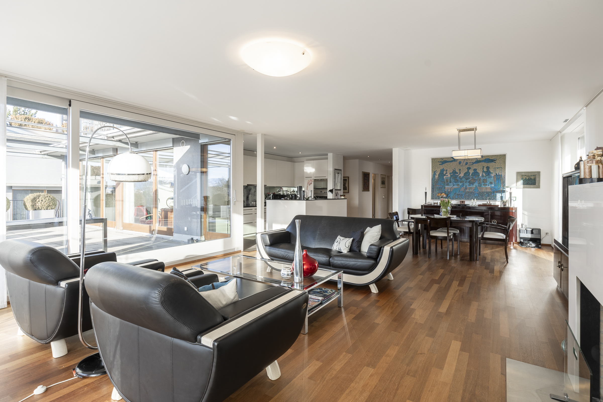 Der Wohn- und Essbereich beeindruckt durch die Grösse sowie mit dem eleganten Cheminée und der angrenzenden erstklassigen offenen Küche. Die riesige Südterrasse ist von hier und von zwei Zimmern zugänglich. Sie bietet enorm viel Platz, um sich eine einmalige Freiluftoase einzurichten – ideal für gesellige Momente mit der Familie und mit Freunden beim Grillieren und Chillen auf der Lounge. Dank der zusätzlichen West- und Ostterrasse geniessen Sie je nach Bedarf auch die Morgen- und die Abendsonne.