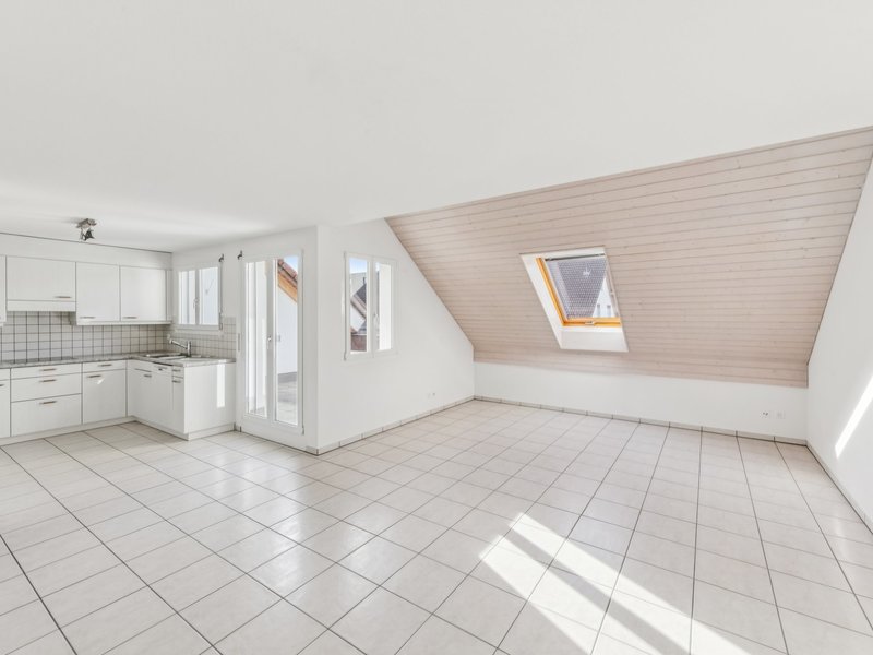 Im Eingangsbereich finden Sie praktische Einbauschränke. Für weiteren Stauraum sorgt das Reduit mit Waschturm. Das lichtdurchflutete Wohn- und Esszimmer wird durch eine offene Küche ergänzt und bietet Zugang auf den gedeckten grossen Balkon.
