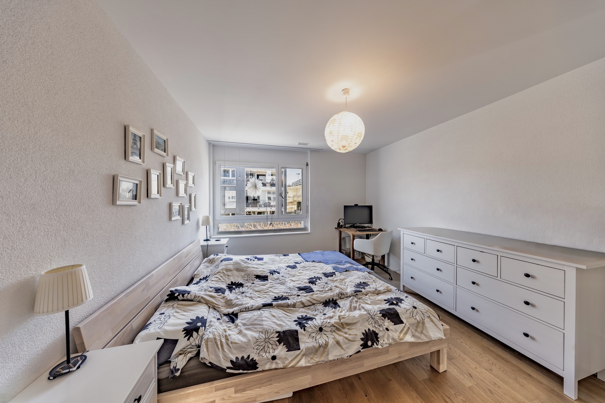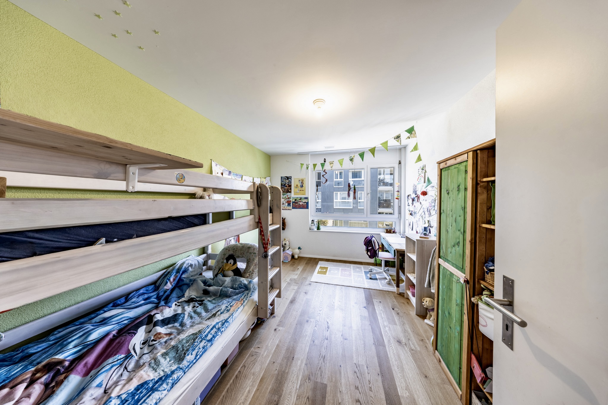 Im ruhigeren Bereich Ihres neuen Zuhauses befinden sich drei helle Zimmer sowie zwei moderne Nasszellen: ein Badezimmer mit Badewanne und eines mit Dusche. Praktisch ist zudem das separate Reduit, das neben zusätzlichem Stauraum mit einem eigenen Waschturm ausgestattet ist.