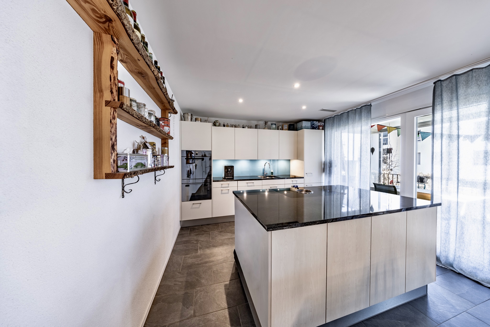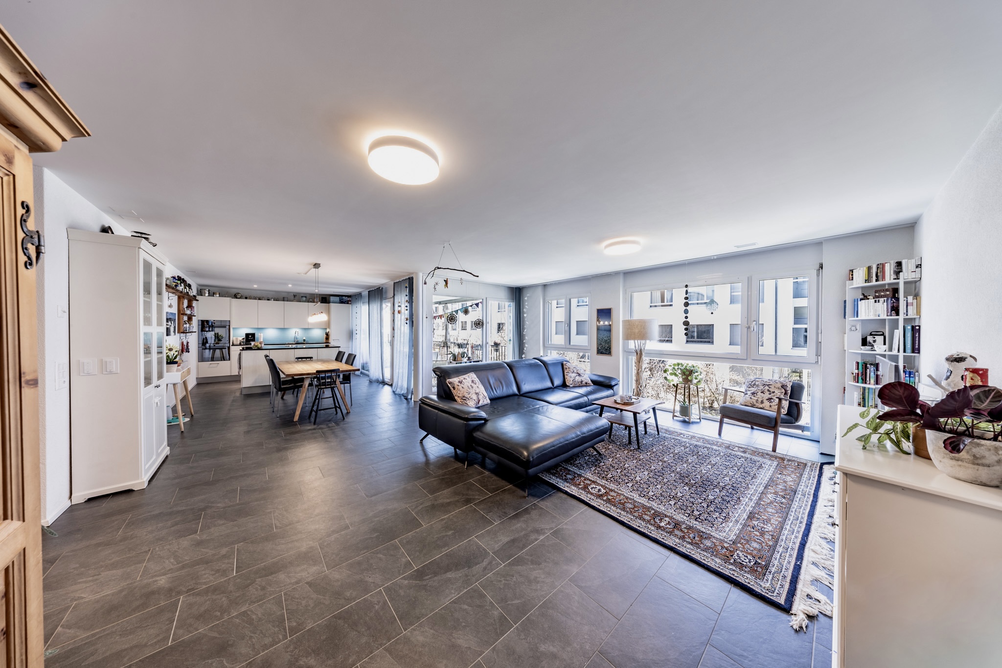 Der offene Wohn-, Ess- und Küchenbereich bildet das Herzstück der Wohnung. Dank grosszügiger Fensterfronten ist dieser Bereich lichtdurchflutet und schafft eine einladende Wohnatmosphäre. Die moderne Küche verfügt über eine stilvolle Kochinsel, viel Stauraum sowie erstklassige Geräte von V-ZUG.