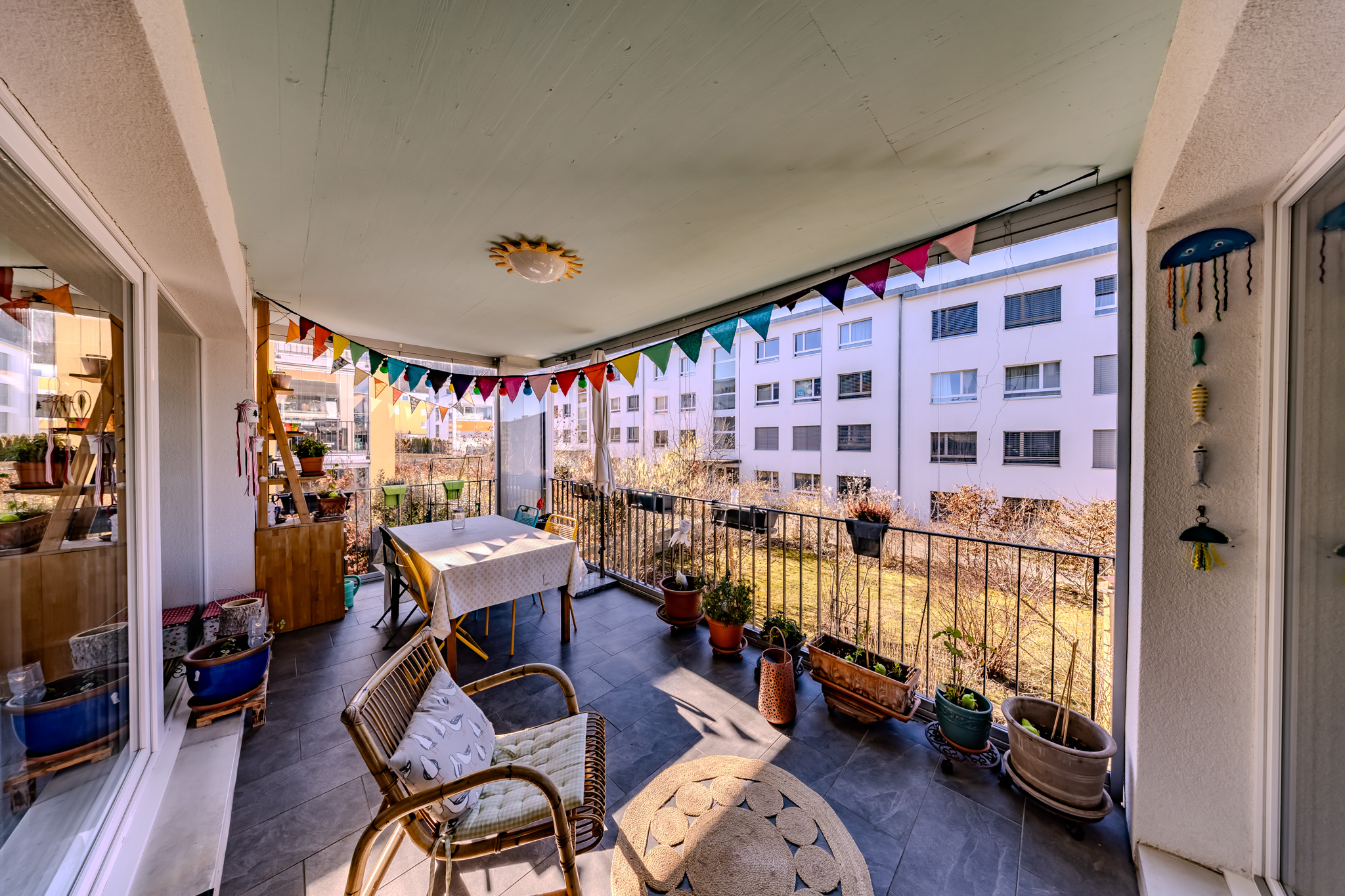 Ein besonderes Highlight ist die 15 m² grosse, verglaste Loggia. Die Glasfronten lassen sich komplett öffnen, sodass dieser Aussenraum sowohl an sonnigen Tagen als auch bei kühlerem Wetter genutzt werden kann.