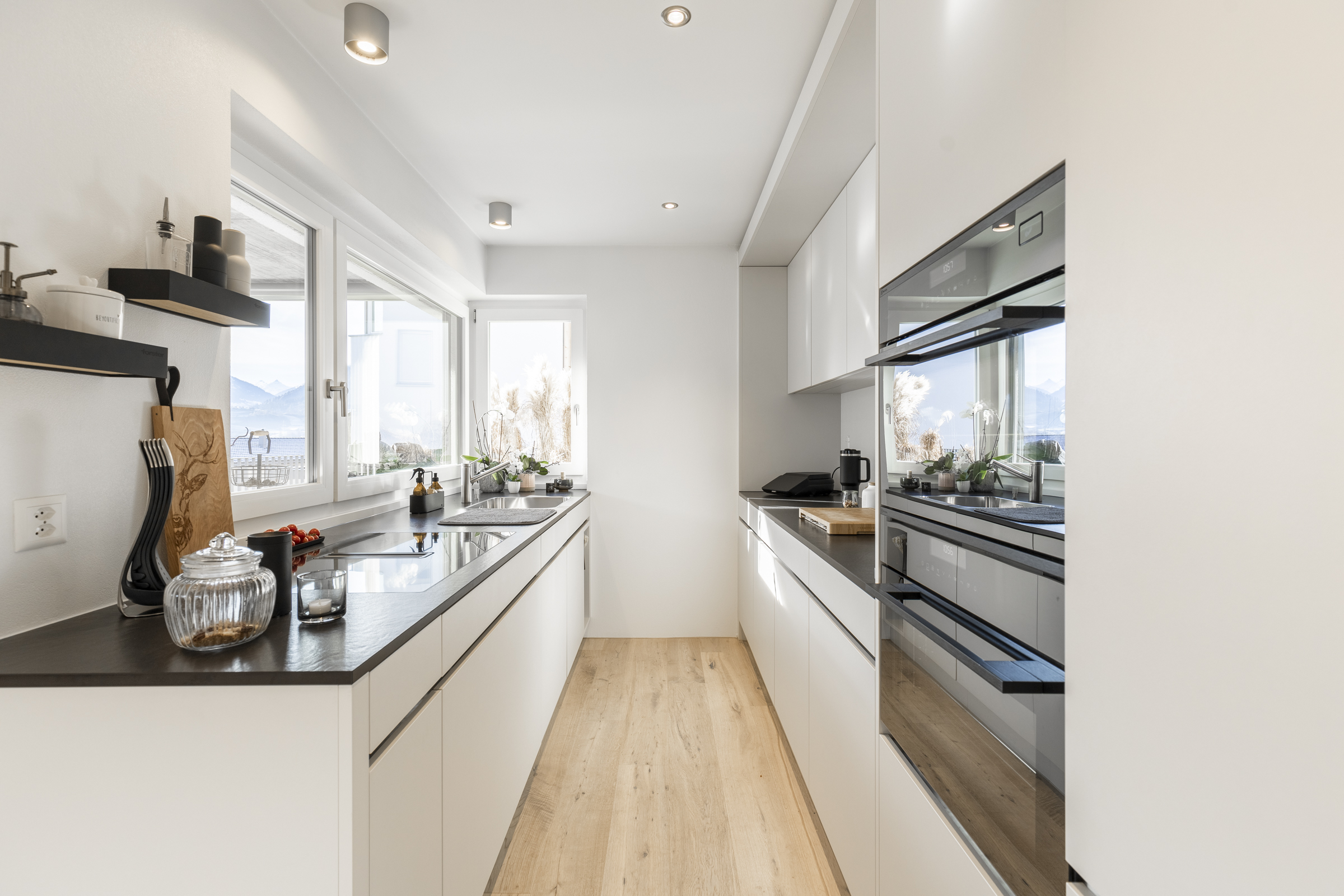 Die erstklassige Wohnküche ist der Treffpunkt für alle, denn sie lädt ein zum gemeinsamen Kochen, Backen und Naschen. Wie zusätzliche Zimmer im Freien wirken der Balkon und die Terrasse, auf denen Sie die herrliche Sonne ganz ungestört geniessen können. Schliesslich stehen Ihnen im Untergeschoss mit der eigenen Waschküche und dem Hobbyraum weitere Möglichkeiten zur Verfügung. Zu diesem einmaligen Angebot gehören zudem zwei Parkplätze in der Tiefgarage.