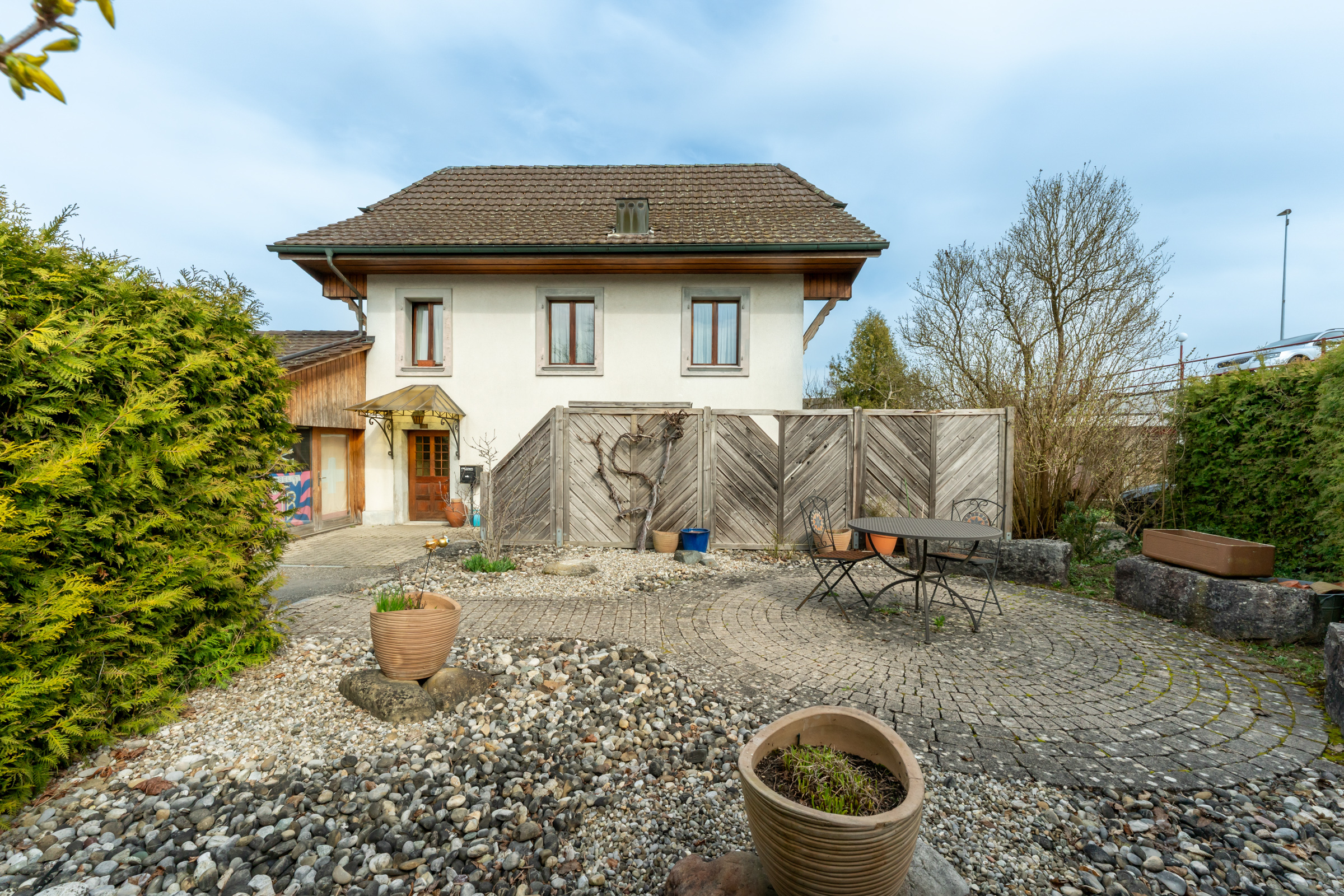 Der Aussenbereich bietet sowohl einen privaten Sitzplatz zur alleinigen Nutzung als auch einen zusätzlichen gemeinschaftlichen Garten mit viel Platz. Ein Gartenhaus sowie ein Pavillon erweitern die Nutzungsmöglichkeiten im Freien. Direkt vor dem Haus sind zwei Abstellplätze vorhanden.