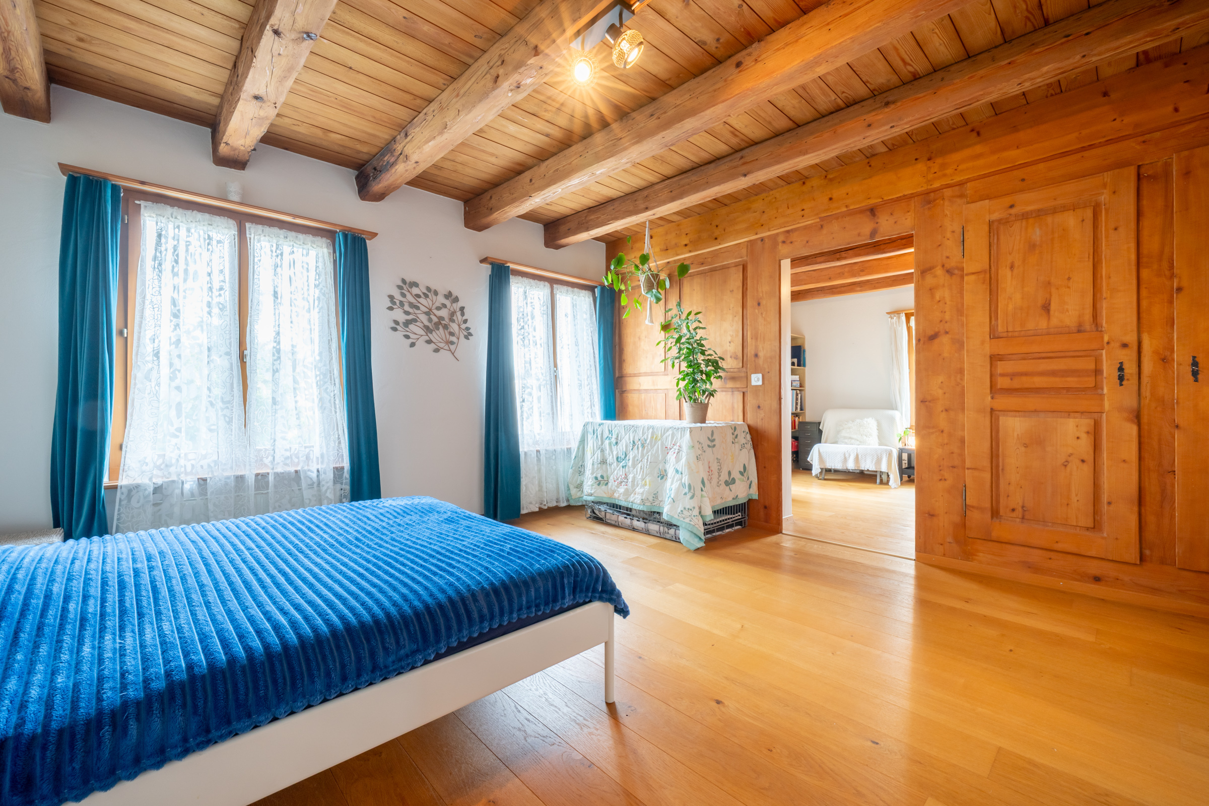 Im Obergeschoss befindet sich der umfangreiche Wohn- und Essbereich, der vielfältige Einrichtungsmöglichkeiten bietet. Die geschlossene Küche ist funktional angeordnet und vom Wohnbereich klar getrennt. Zwei Schlafzimmer mit schönem Holzboden und Einbauschränken sorgen für eine angenehme Wohnqualität. Ergänzt wird diese Etage durch zwei Nasszellen: eine Dusche mit Lavabo und WC sowie ein Badezimmer mit Badewanne, Dusche und Lavabo.