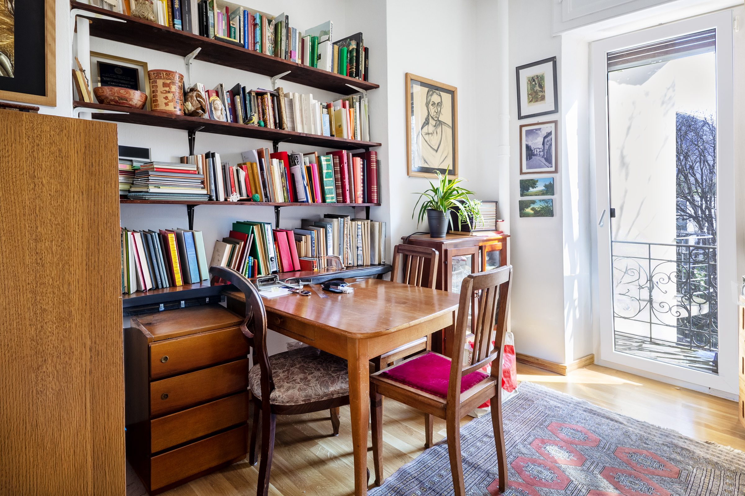 L’appartamento è al secondo piano (ultimo) con un’esposizione su tre lati e molto soleggiata. L’abitazione è uno spazioso 5 locali di 133 mq calpestabili netti, al quale si aggiunge una mansarda indipendente di 27 mq netti abitabili. Gli interni sono stati parzialmente rinnovati nel 2017 conservando le caratteristiche dell’epoca come porte antiche e pavimenti. Da uno spazioso ingresso si raggiunge un soggiorno, un piccolo studio ed un bagno con doccia. Un corridoio illuminato da ampie vetrate si sviluppa su due lati: da un lato la zona notte con due camere da letto ed un bagno con vasca, dall’altro la sala pranzo con balcone, locale di grande fascino, la cucina abitabile ed una ulteriore camera da letto. Nel sottotetto si trova un piccolo pied à terre con soggiorno con cucina, camera e bagno doccia. Il riscaldamento è condominiale con caldaia alimentata a gas naturale. Un posteggio esterno ed una spaziosa cantina completano questa affascinante proprietà.