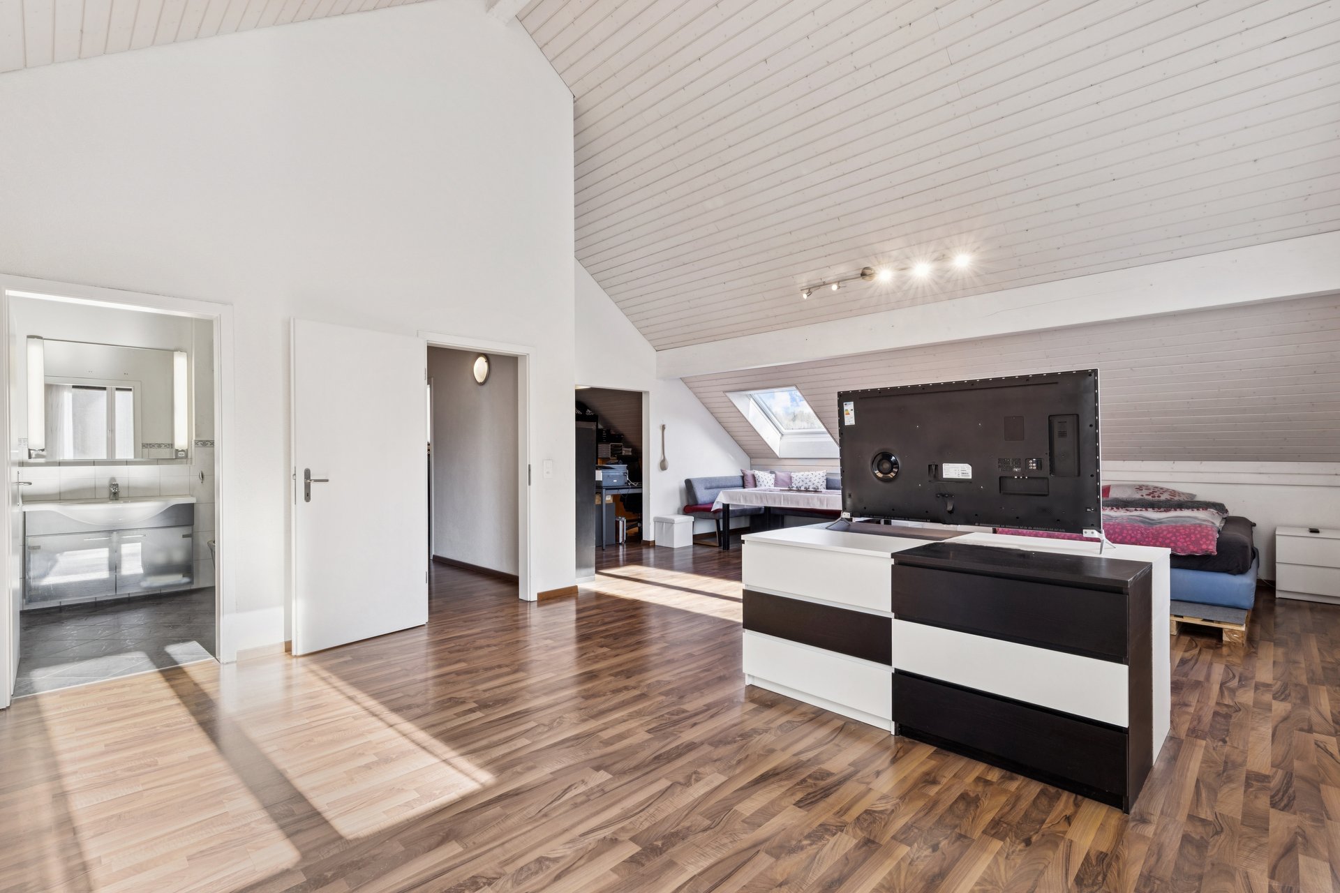 Die behaglichen drei Schlafzimmer schaffen angenehme Rückzugsmöglichkeiten für die ganze Familie. Besonders hervorzuheben ist das grosse, offen gestaltete Schlafzimmer mit Bad en suite. Mit einer Trennwand lässt sich dieser Raum problemlos in zwei separate Zimmer unterteilen. Somit haben Sie bei Bedarf eine 5.5-Zimmer-Wohnung zur Verfügung. Ein zusätzliches Badezimmer mit Dusche sorgt für zeitgemässen Komfort.