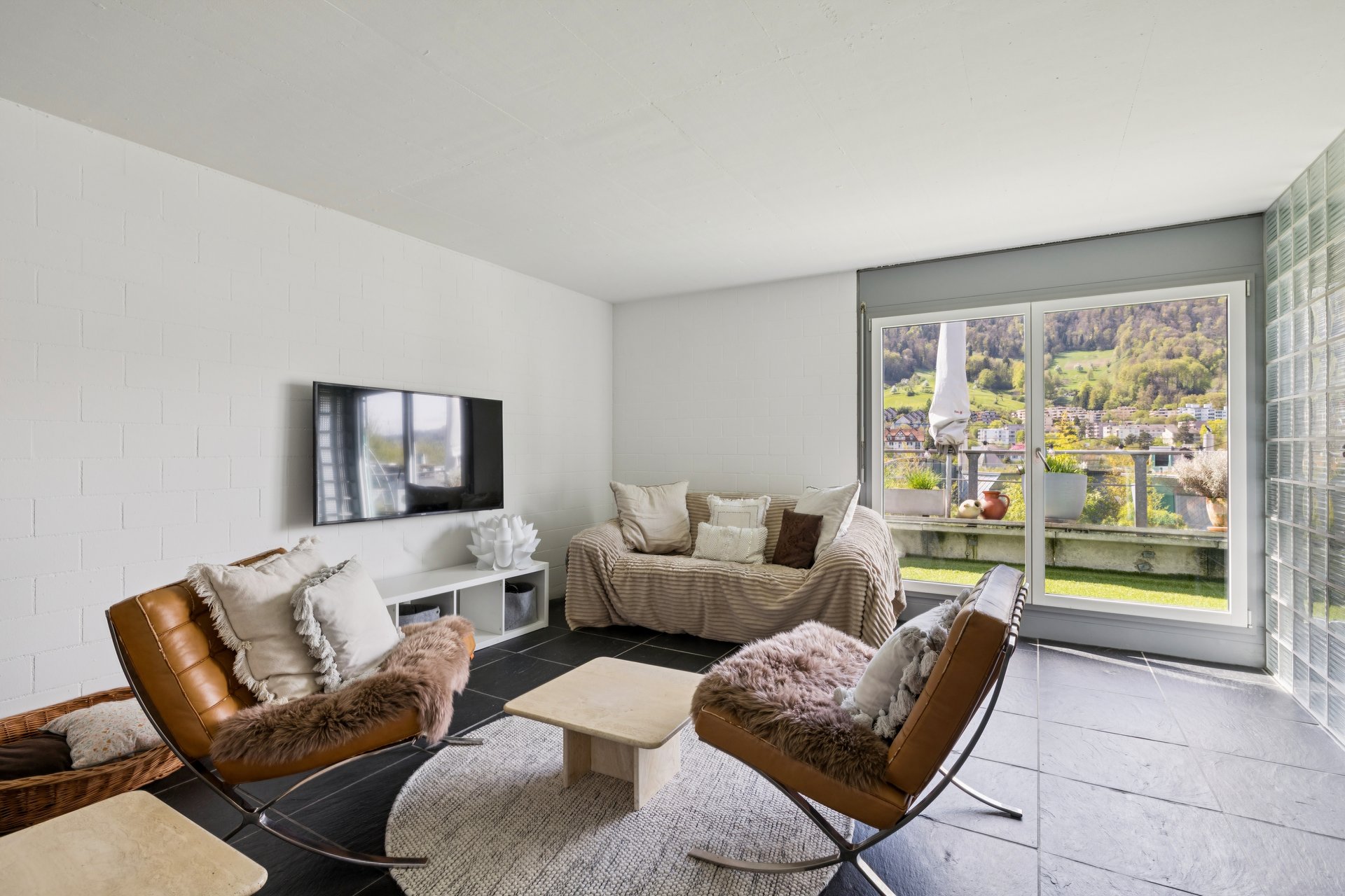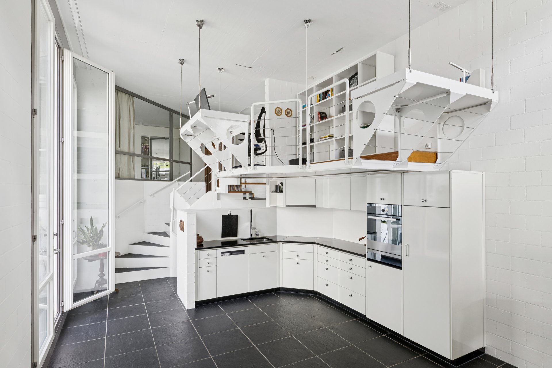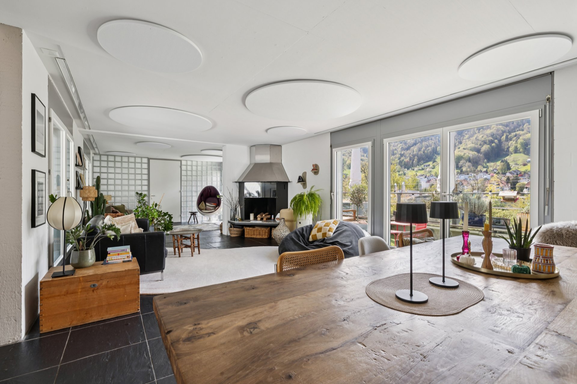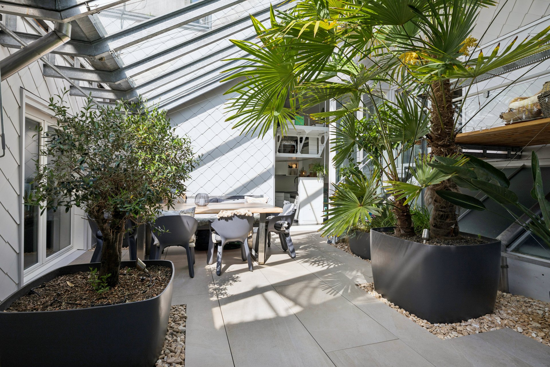 Ergänzt wird das Raumkonzept durch eine offene Galerie sowie mit einem praktischen Reduit. Vier grosse Nasszellen, bestehend aus ein Bad und drei Duschen sorgen für hohen Wohnkomfort auch bei grösseren Haushalten. Die Wohnung verfügt über zwei voll ausgestattete Küchen und zwei weitläufige Wohnbereiche, die durch ihre Helligkeit und den direkten Zugang zur Dachterrasse überzeugen. Von hier aus eröffnet sich eine atemberaubende Aussicht ins Grüne sowie auf die umliegende Nachbarschaft.