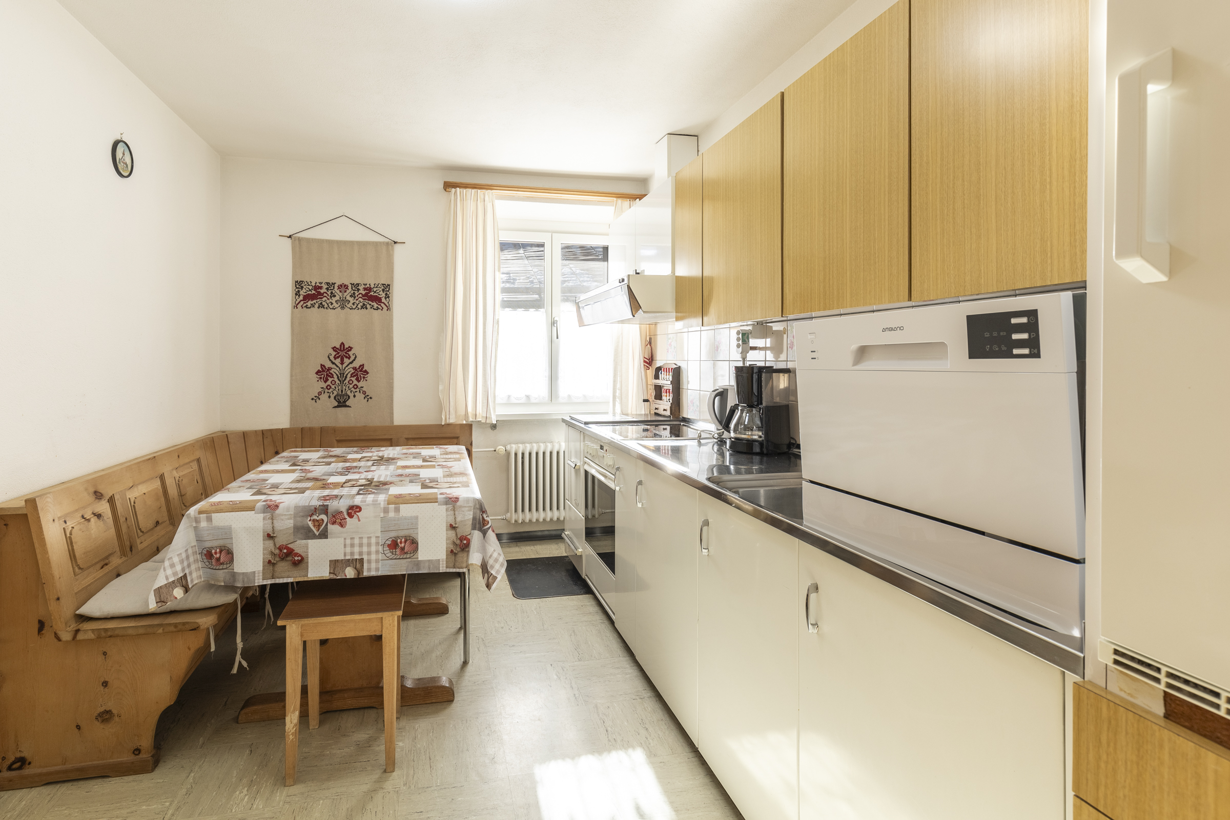 Der Innenausbau ist unter anderem mit Arvenholz gestaltet und schafft ein heimeliges Ambiente. Der umfangreiche Keller bietet genug Stauraum für alle Parteien. Für die Fahrzeuge stehen sieben Aussenabstellplätze und eine Garage zur Verfügung.