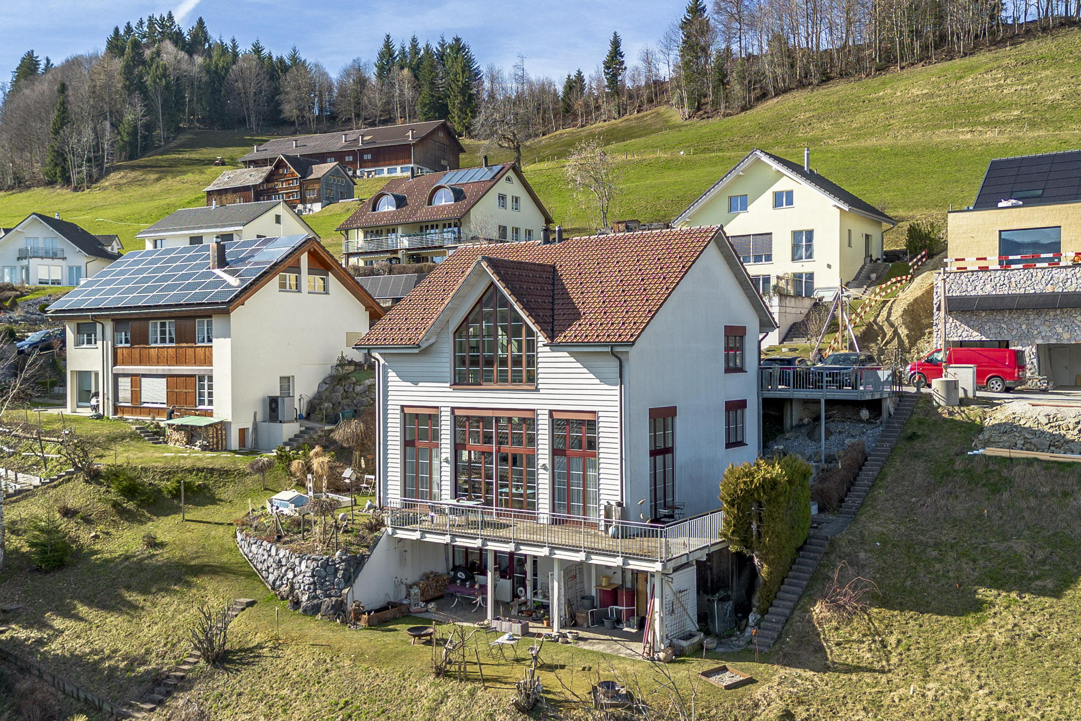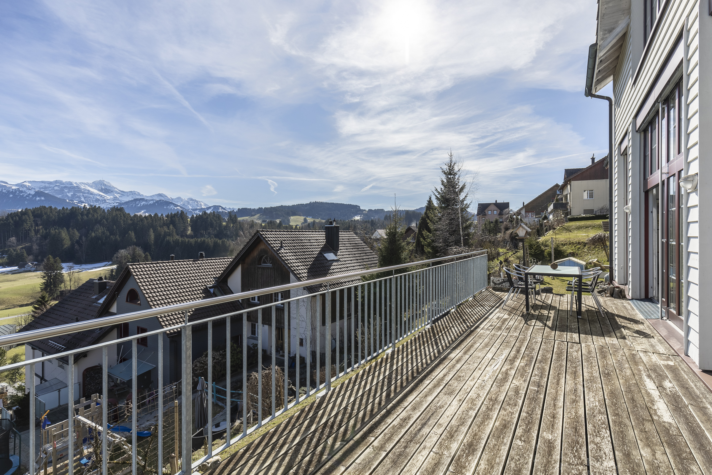Dieses einzigartige, freistehende 5.5-Zimmer-Einfamilienhaus präsentiert sich an ruhiger, sonnenverwöhnter Hanglage mit traumhafter Sicht auf den Säntis. Die Sackgasse garantiert familienfreundliches Wohnen ohne Durchgangsverkehr. Die Bushaltestelle ist innerhalb von rund acht Minuten zu Fuss erreichbar.