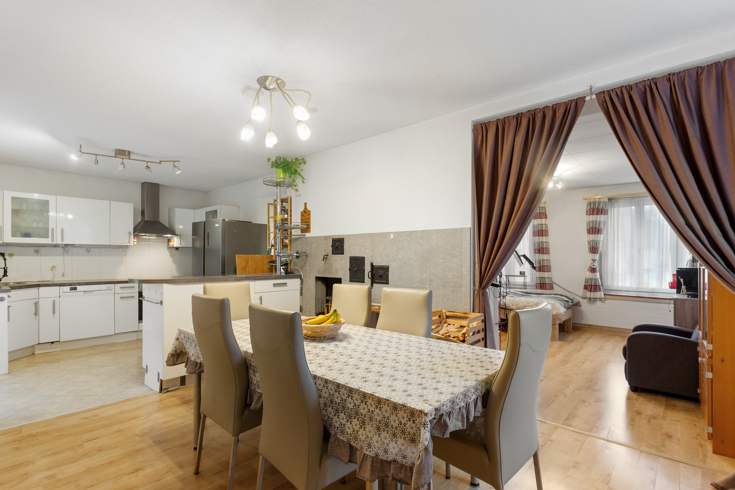 Die Liegenschaft bietet viel Platz für eine Grossfamilie und ist auch für Handwerker geeignet, die zusätzliche Lager- und Nebenräume benötigen. Das Haus zeigt sich in einem bewohnbaren Zustand, weist aber vor allem im Innenausbau Renovationsbedarf auf.