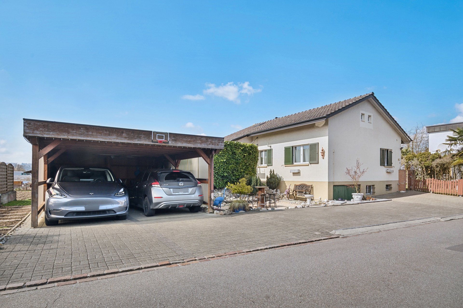 Der mit einer Ladestation für E-Autos ausgerüstete Carport für zwei Fahrzeuge und vier Aussenparkplätze vervollständigen dieses attraktive Angebot.