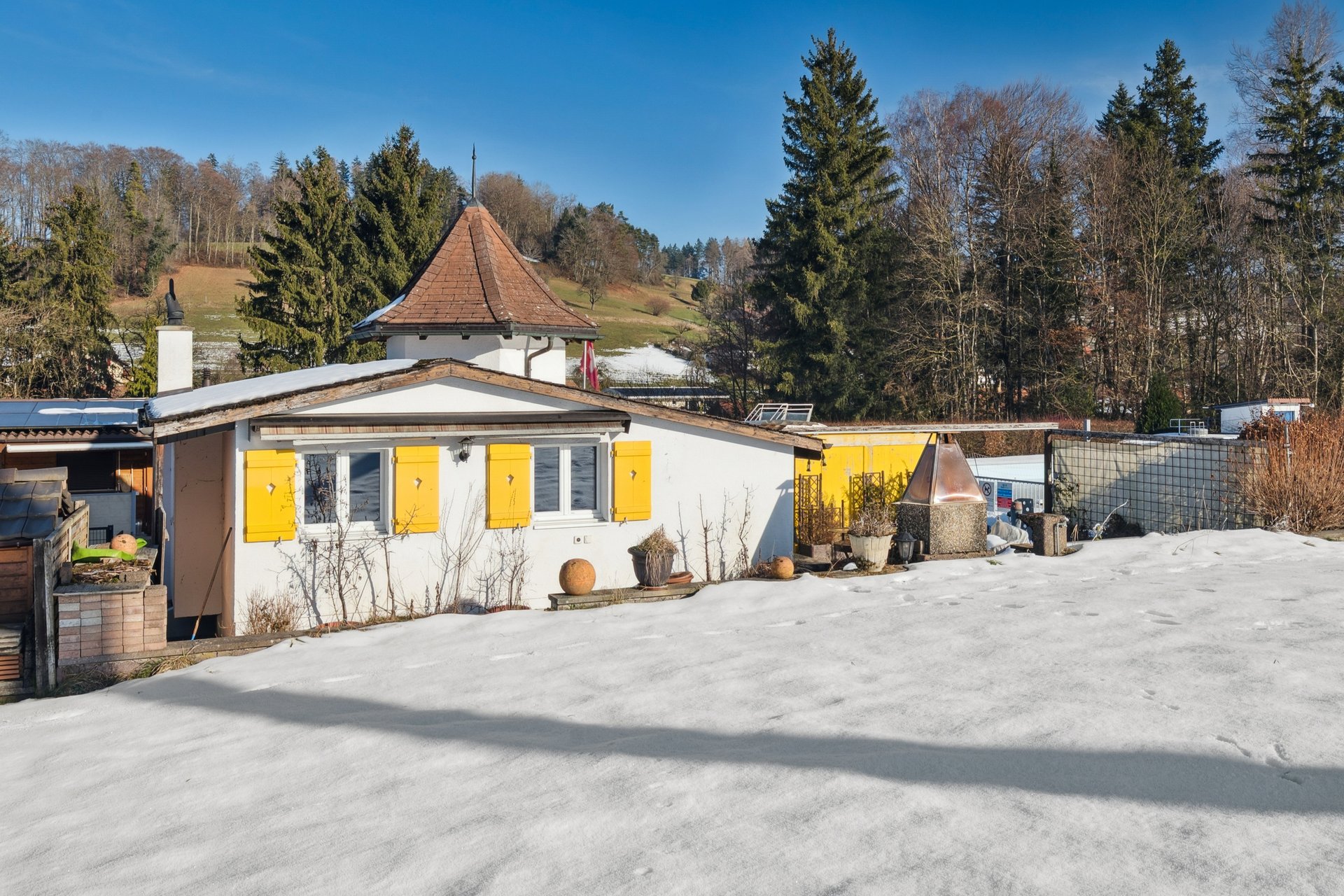 Ein weiterer Pluspunkt ist die attraktive Gemeinschaftsanlage: In den Sommermonaten steht ein grosses Schwimmbad zur Mitbenutzung zur Verfügung und bietet eine willkommene Abkühlung an warmen Tagen. Gleichzeitig ist die Siedlung längst nicht nur ein Ferienort – rund 80 % der Bewohner leben ganzjährig hier.