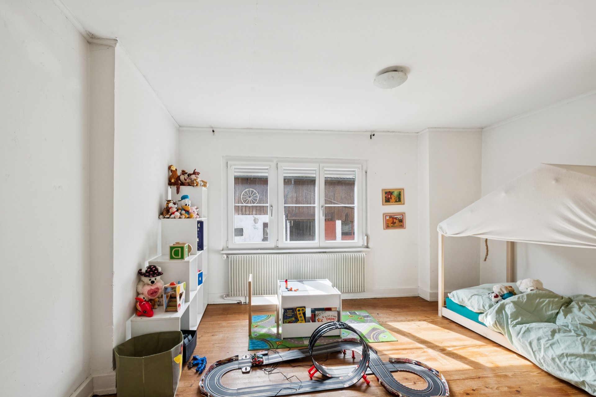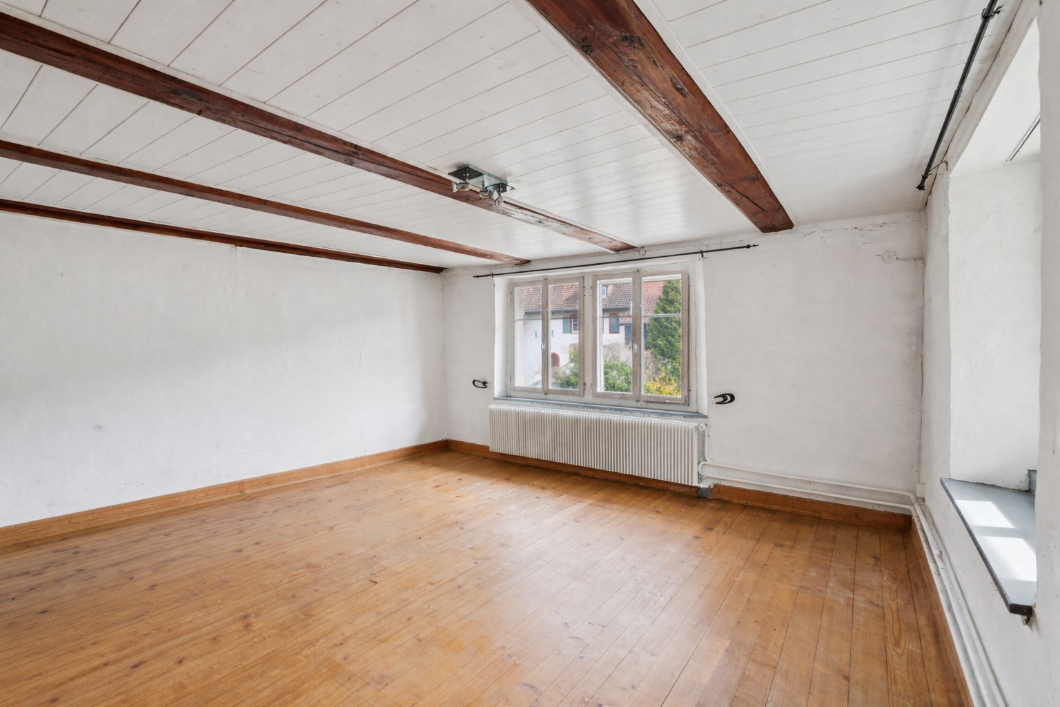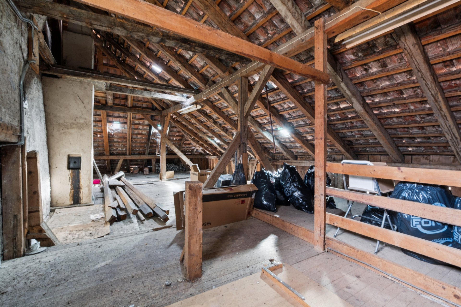 Im Obergeschoss erwarten Sie drei grosszügig geschnittene Zimmer. Eines davon ist als Durchgangszimmer gestaltet und eignet sich hervorragend als Office oder Aufenthaltsraum, von dem Sie direkt auf den Balkon gelangen. Ein zusätzlicher Abstellraum führt weiter in das ausgedehnte Dachgeschoss, das weiteren Stauraum oder Potenzial für künftige Projekte bietet.
