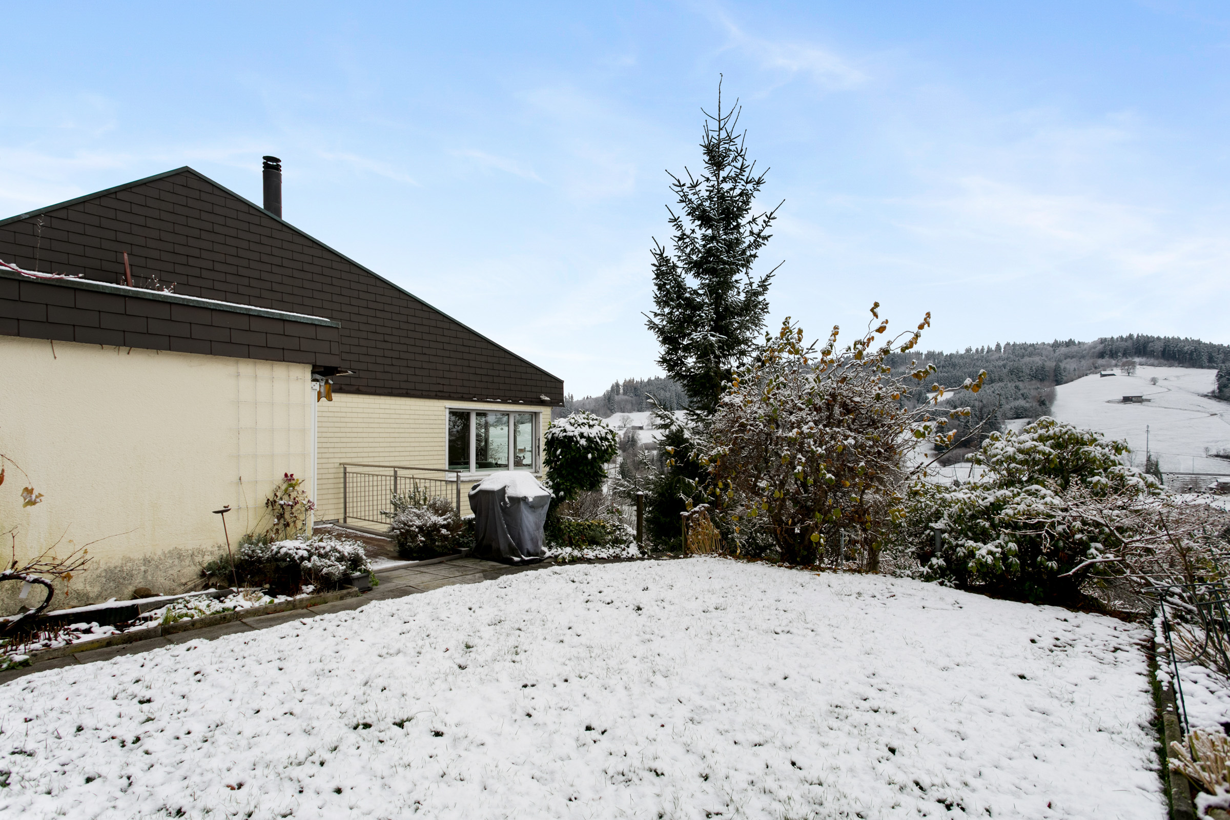 Der lichtdurchflutete Wohnbereich mit Schwedenofen lädt zum Entspannen ein und offenbart eine atemberaubende Aussicht. Die Küche ist ebenfalls geräumig konzipiert und verfügt über einen direkten Zugang zur überdachten Terrasse sowie zum angrenzenden Garten. Die Wohnetage umfasst ein stilvolles Badezimmer mit Dusche, ein separates Gäste-WC sowie vier Schlafzimmer mit Parkettboden.
