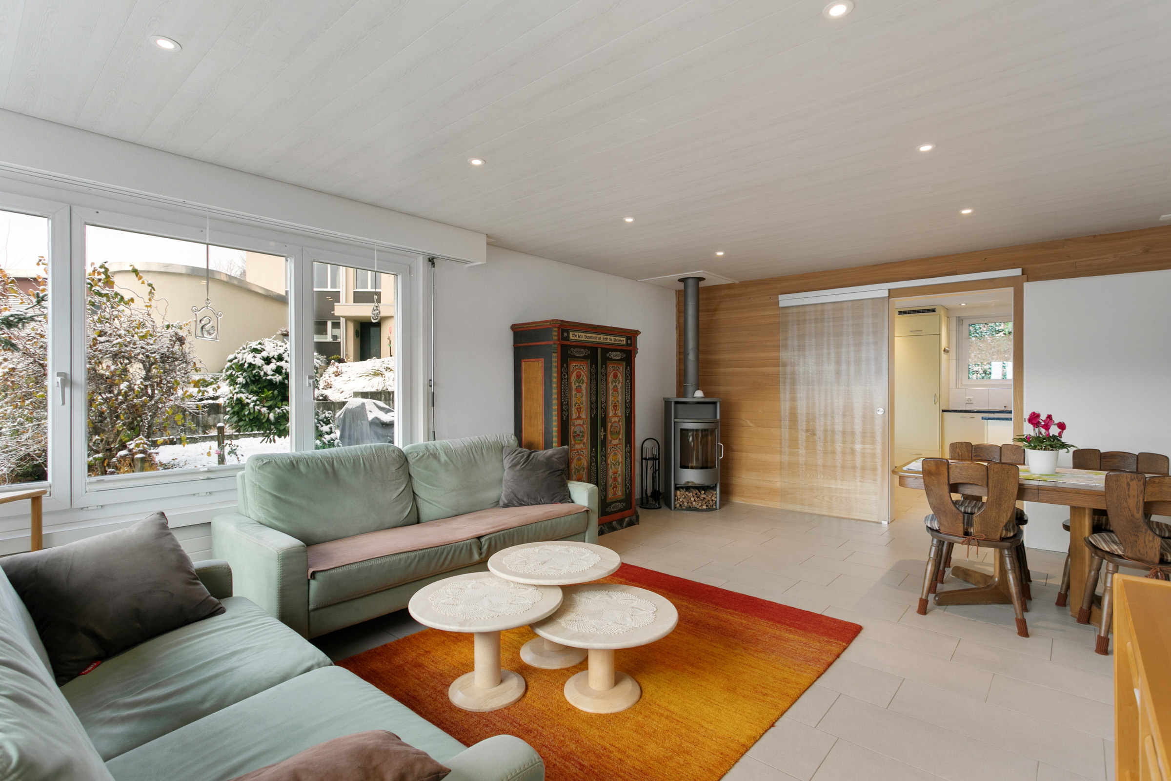 Die Einliegerwohnung mit separatem Eingang bietet zusätzlichen Wohnkomfort: ein einladender Wohn- und Essbereich, eine Küche, zwei Zimmer und ein Badezimmer. Perfekt für Familienmitglieder, Gäste oder die Nutzung als Atelier, Büro oder Geschäftsräumlichkeit.