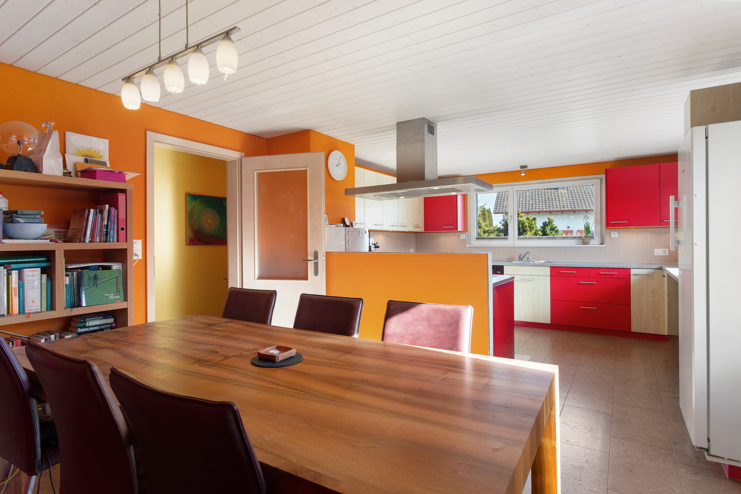 Bereits beim Betreten der Liegenschaft überzeugt der einladende Grundriss mit lichtdurchfluteten Räumen und einem durchdachten Raumkonzept. Die grosszügige Küche bildet das Herzstück des Hauses. Sie begeistert mit viel Platz zum Kochen, Geniessen und Zusammensein.