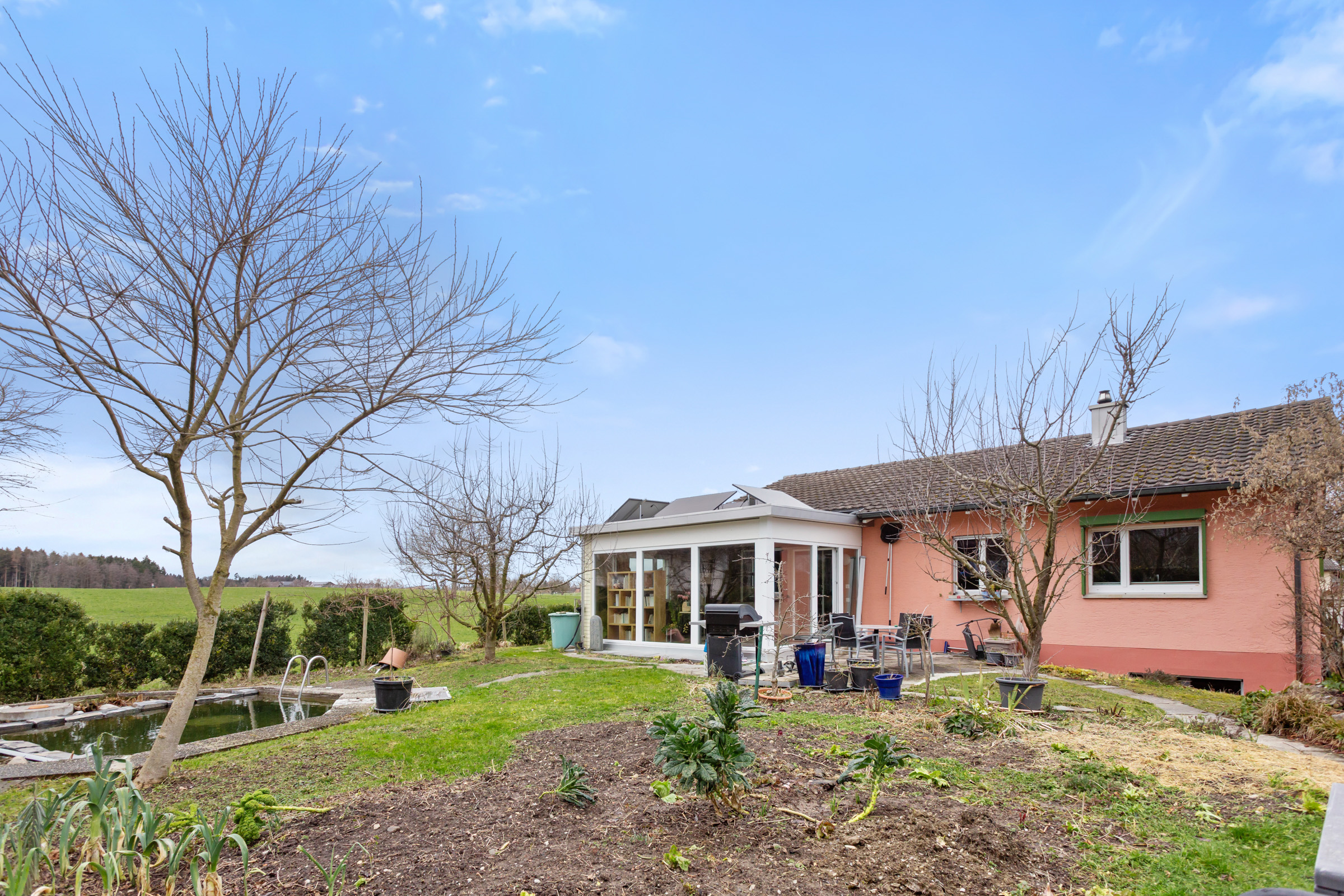 Der grosse Garten lässt Naturherzen höherschlagen: liebevoll angelegt, mit viel Platz zum Entspannen, Spielen oder Gärtnern. Der natürliche Schwimmteich macht das Aussenparadies perfekt.