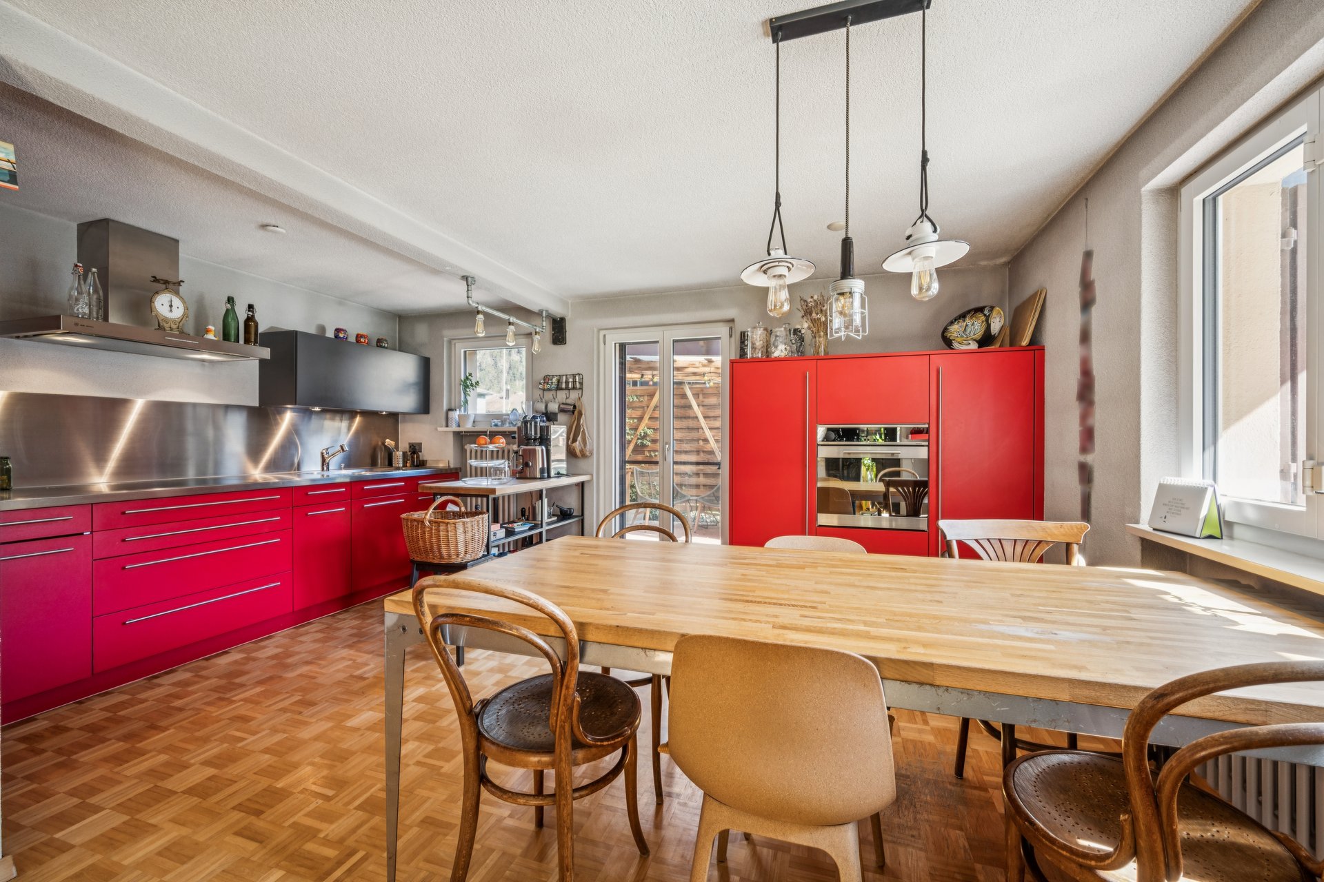 Die Küche ist grosszügig gestaltet und lädt zum gemeinsamen Kochen ein. Ergänzt wird das Erdgeschoss durch einen Keller sowie eine Waschküche mit WC.
