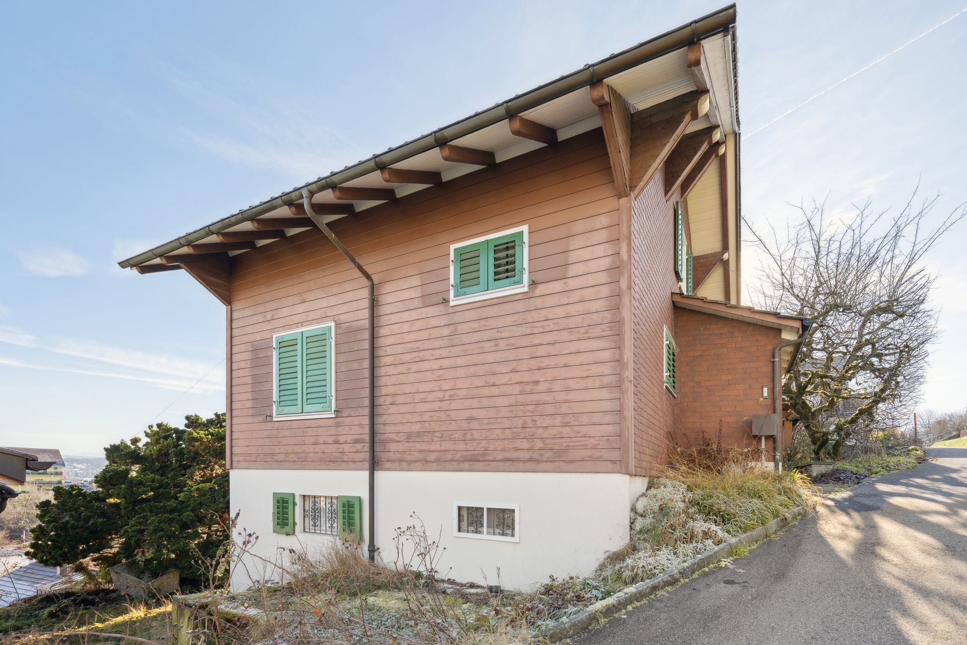 Das Haus im Chalet-Stil eignet sich mit seinen rund 82 m² Wohnfläche ideal für eine Einzelperson oder ein Paar. Es eröffnet vielfältige Möglichkeiten: entweder eine umfassende Renovation oder ein Neubau mit beispielsweise einem modernen Tiny-Haus.