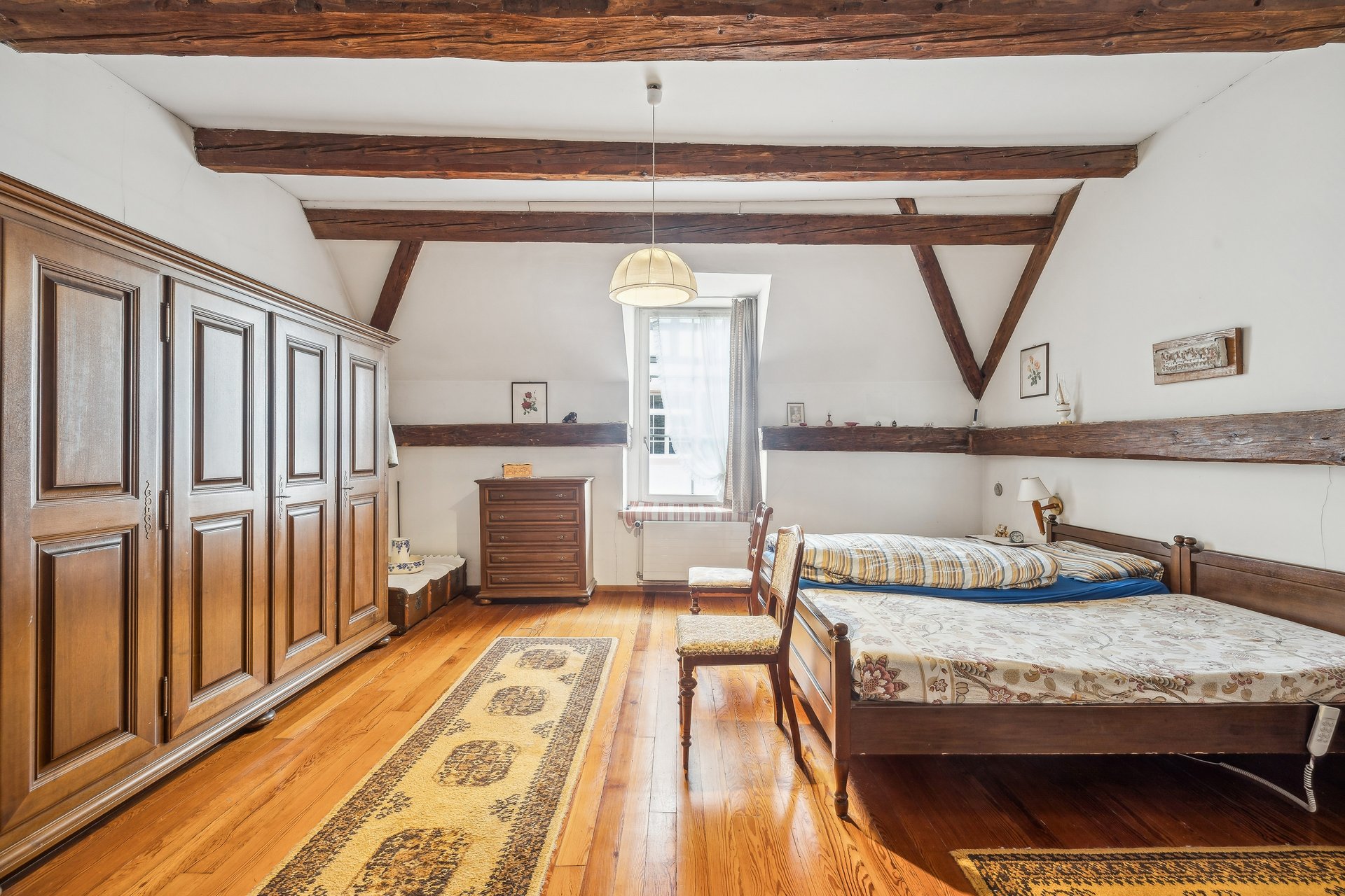 Die Häuser sind nicht vollständig beidseitig angebaut. Dies sorgt für zusätzliche Fensterflächen und bringt viel Licht in die Räume. Ein Kachelofen, Sichtbalken und alte Parkettböden unterstreichen den einzigartigen Charakter dieser wunderbaren Immobilie.