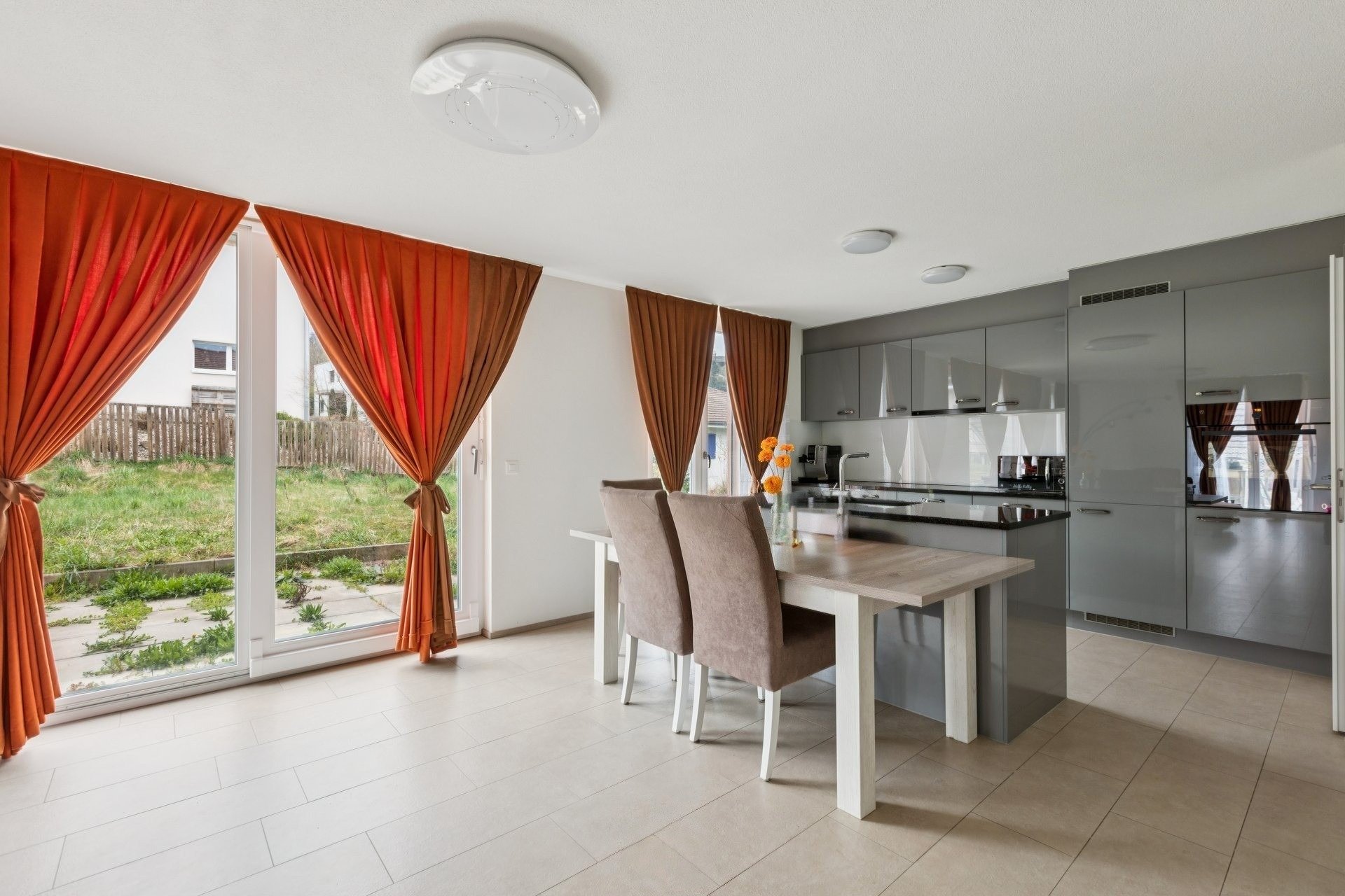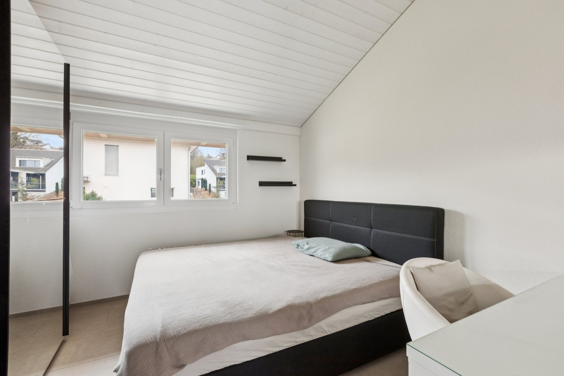 Der Eingangsbereich überzeugt mit einem geräumigen Entrée inklusive Garderobe. Gleich daneben befindet sich eines der beiden Badezimmer mit Dusche und WC. Das Highlight des Erdgeschosses ist die offene Küche mit einer grosszügigen Kochinsel, von der man in den Ess- und Wohnbereich blickt. Das Reduit ist direkt neben der Küche angeordnet und bietet praktischen Stauraum für Küchengeräte oder Vorräte. Diese Wohnebene wird mit einem weiteren Zimmer abgerundet und ermöglicht zudem den Zugang zum naturbelassenen Garten und zum Sitzplatz.