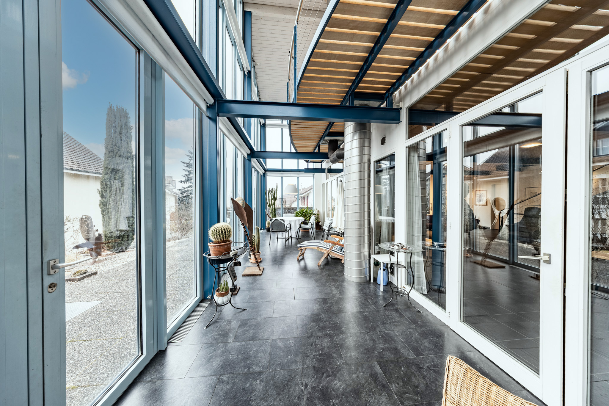 Die Treppe führt ins Erdgeschoss direkt zum weitläufigen Wohn- und Esszimmer mit dem stilvollen Cheminée. Die angrenzende erstklassige Küche sowie ein Zimmer und ein Badezimmer ergänzen diese Wohnebene. Als besonderes Highlight erweist sich hier zudem der herrliche Wintergarten, der sich über zwei Etagen erstreckt. Der Clou: Der Innenbalkon, der von den zwei Schlafzimmern im Obergeschoss zugänglich ist und den Blick durch die Fenster des Wintergartens zum Aussenbereich freigibt. Das grosse Badezimmer mit Dusche sowie zwei Balkone – einmal mit Whirlpool und Sichtschutz – vervollständigen das einmalige Angebot.