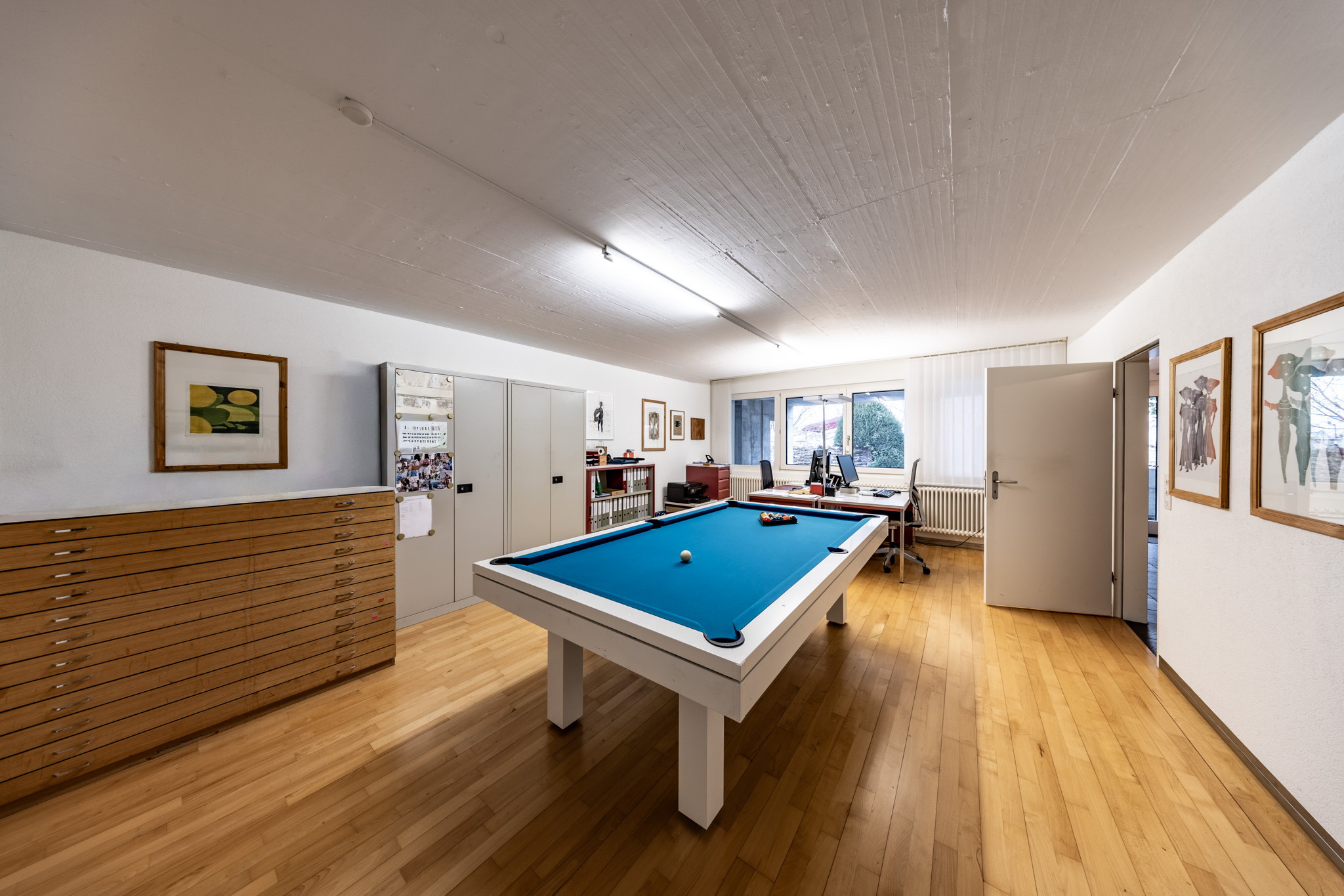 Sie betreten Ihr neues Zuhause aufgrund der leichten Hanglage entweder vom ebenerdig zugänglichen Carport im Untergeschoss oder über den zweiten Eingang im Erdgeschoss. Das Untergeschoss beinhaltet ausser den zahlreichen Nebenräumen ein Büro/Ankleide und einen riesigen Hobbyraum, in dem sogar ein Billardtisch Platz findet.