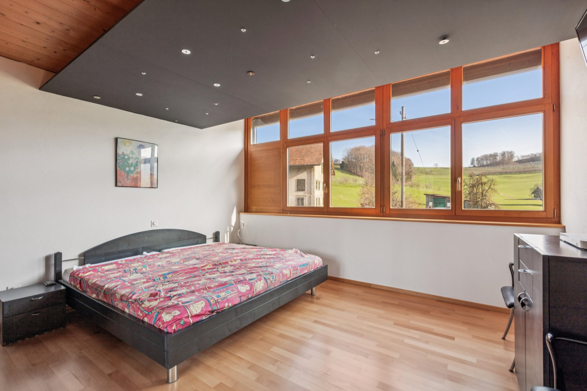 Im Dachgeschoss steht ein weiteres Zimmer zur Verfügung, das aufgrund der Dachschrägen in der Nutzung eingeschränkt ist.