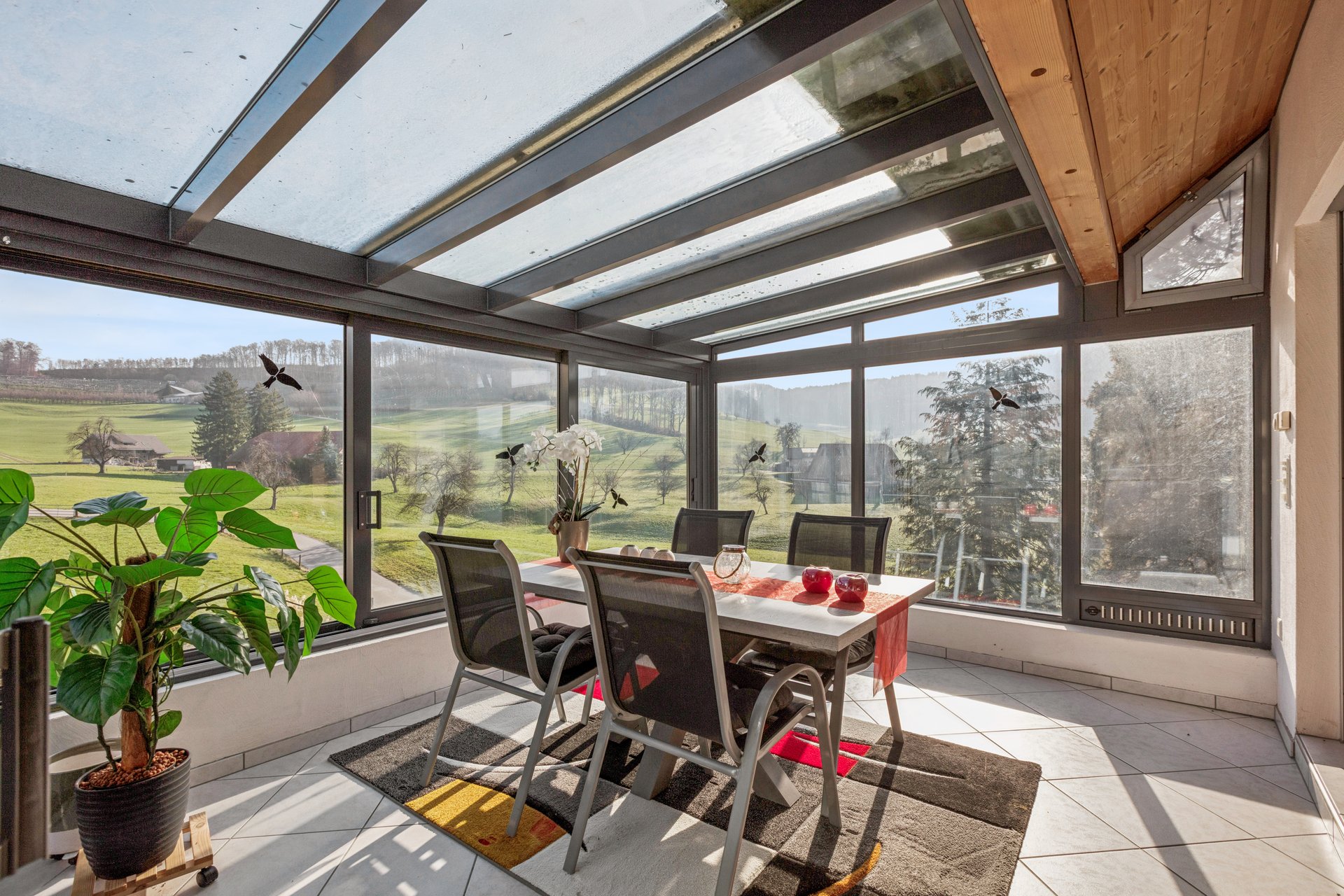 Im Erdgeschoss schaffen die gemütliche Küche mit Essnische und der einladende Wohnbereich mit Cheminée sowie ein beheizter Wintergarten eine wohnliche, helle Atmosphäre. Eine separate Toilette ergänzt das Raumangebot auf dieser Etage. Der pflegeleichte Plattenboden sorgt für ein harmonisches Wohnambiente.