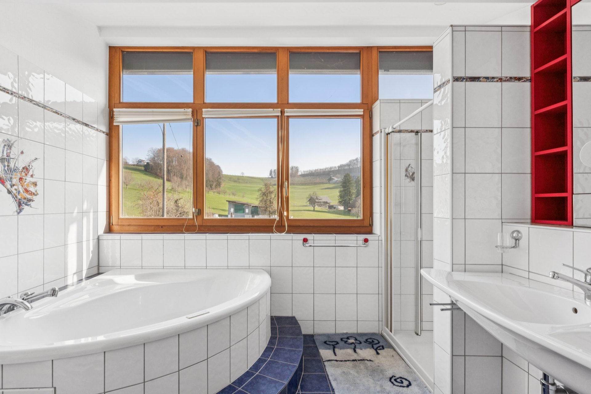 Im ersten Obergeschoss befinden sich drei Zimmer, allesamt mit Parkettböden ausgestattet. Das grosszügige Familienbad verfügt über eine Dusche sowie eine Eckbadewanne mit Sprudelfunktion und zeigt sich in einem gepflegten Zustand. Die Waschküche ist über eines der Zimmer zugänglich und dient gleichzeitig als Durchgang zum unbeheizten Schopf.