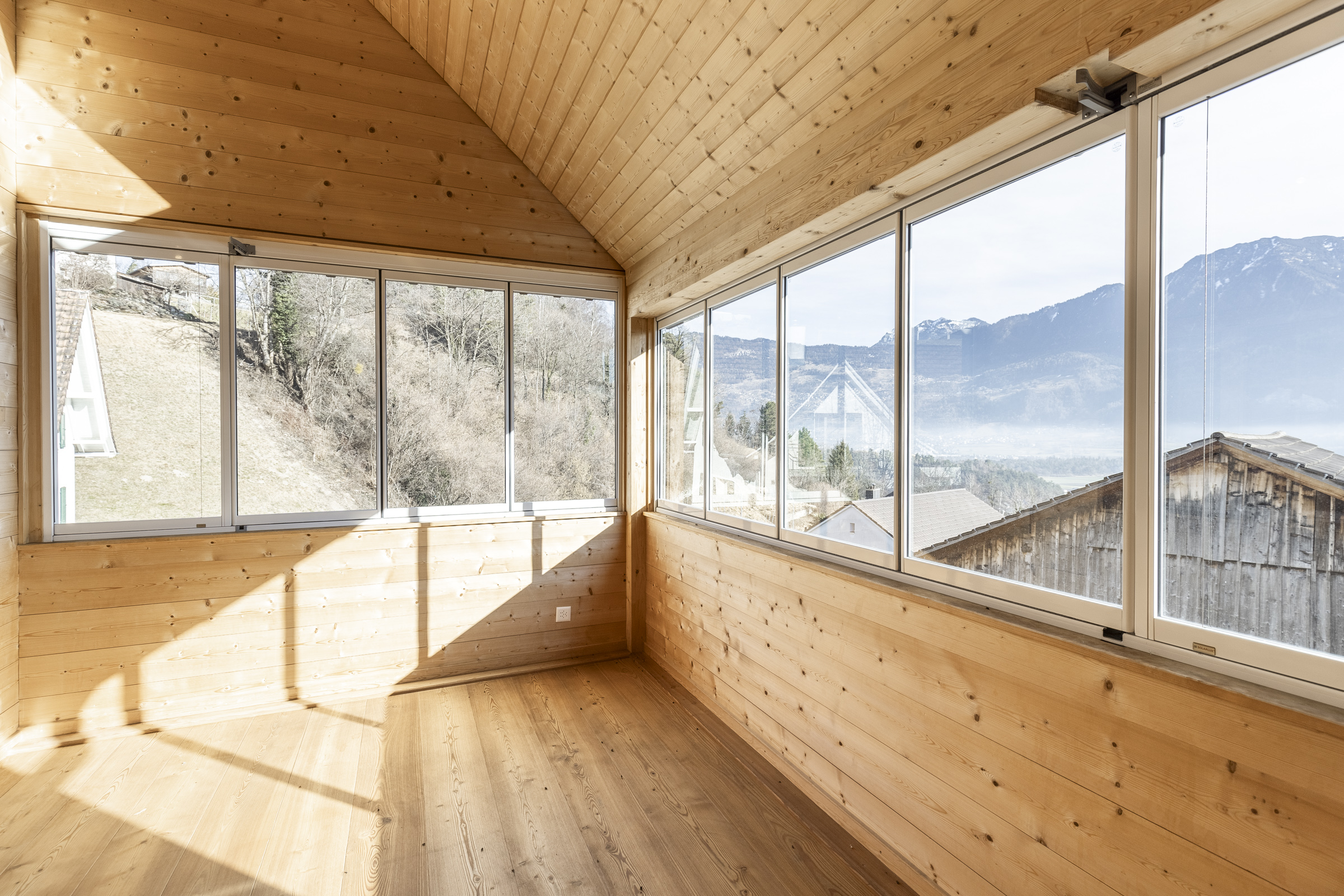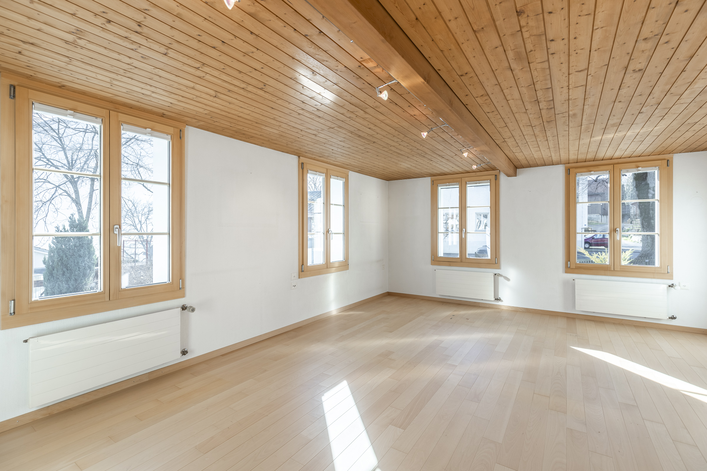 Im Obergeschoss stehen drei harmonisch geschnittene Zimmer zur Verfügung, die sich ideal als Kinder- oder Schlafzimmer eignen. Ein Badezimmer mit Badewanne sorgt für zusätzlichen Komfort. Ein besonderes Plus dieser Etage ist der verglaste und gedeckte Balkon, der einen geschützten Aussenbereich schafft und den Blick in die Umgebung öffnet. Das Dachgeschoss erweitert das Platzangebot mit einem weiteren Zimmer.