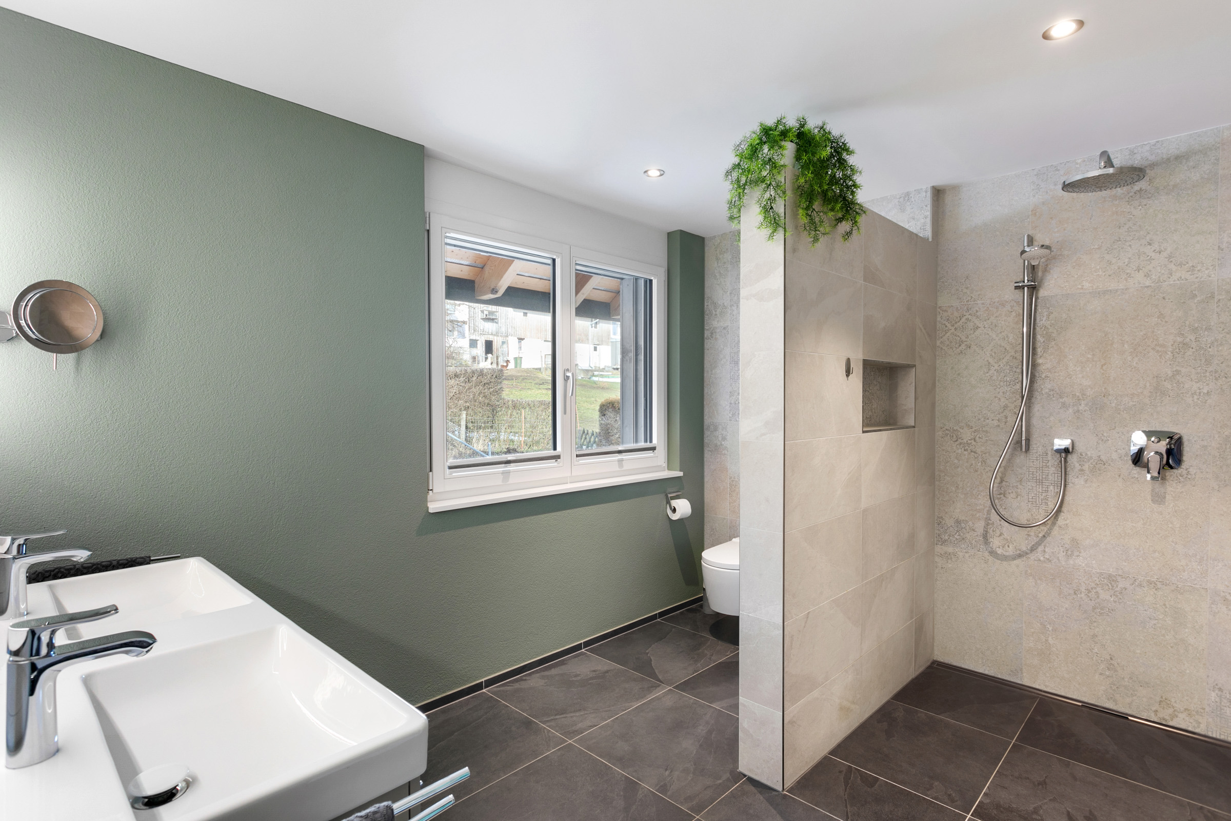 Im Untergeschoss befindet sich ein weiteres Zimmer mit eigener Nasszelle und Dusche, das sich ideal als Gästezimmer oder Homeoffice eignet.