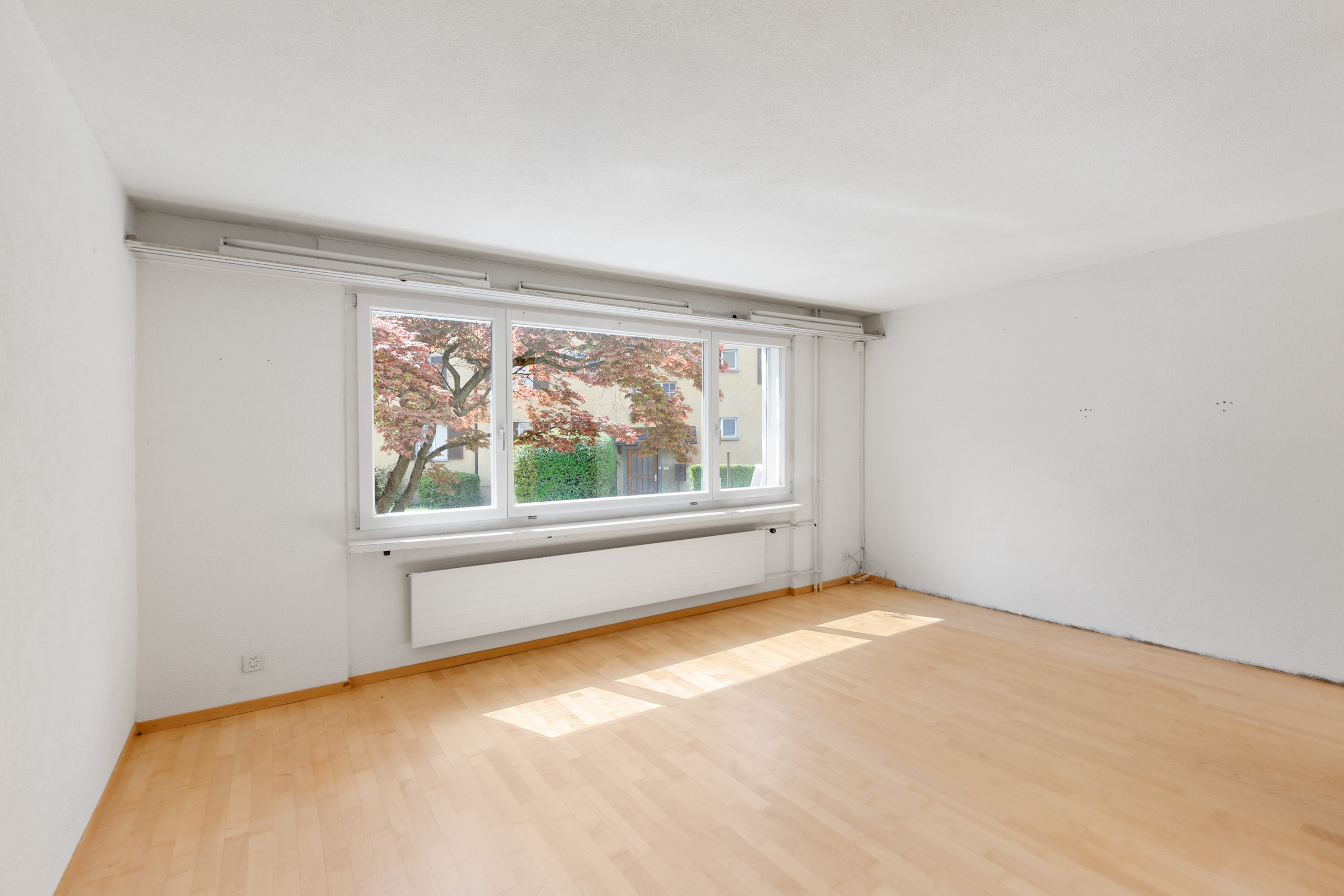 Im Erdgeschoss empfängt Sie ein Eingangsbereich mit Garderobe. Der Wohnbereich überzeugt durch eine angenehme Wohnatmosphäre und bietet einen schönen Blick ins Grüne. Die angrenzende Küche, ein separates WC, sowie ein weiteres Zimmer mit direktem Zugang in den Garten und eigenem Lavabo eröffnen flexible Nutzungsmöglichkeiten, sei es als Gästezimmer, Hobbyraum oder für eine ruhige, separate Arbeitstätigkeit.