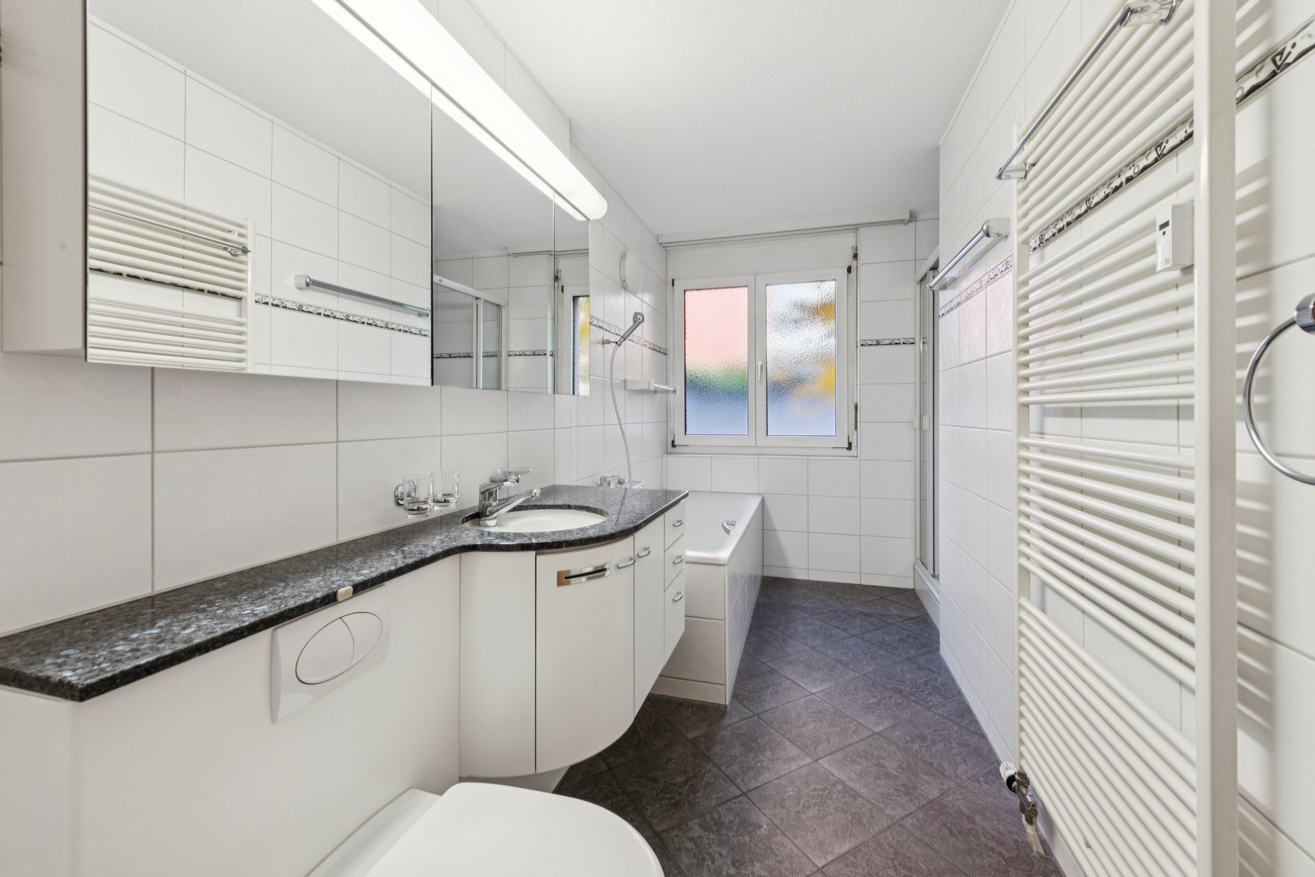 Die Küche mit Granitabdeckung und viel Stauraum zeigt sich grosszügig – perfekt, um jeden Tag mit frischem Elan zu beginnen und gemütlich zu frühstücken. Viel Privatsphäre im Schlafbereich bietet der Durchgang mit Gang zu den drei Zimmern und zum Badezimmer, das mit Badewanne, Dusche, Doppellavabo, WC und einem Fenster für optimale Lüftung und viel Tageslicht überzeugt.