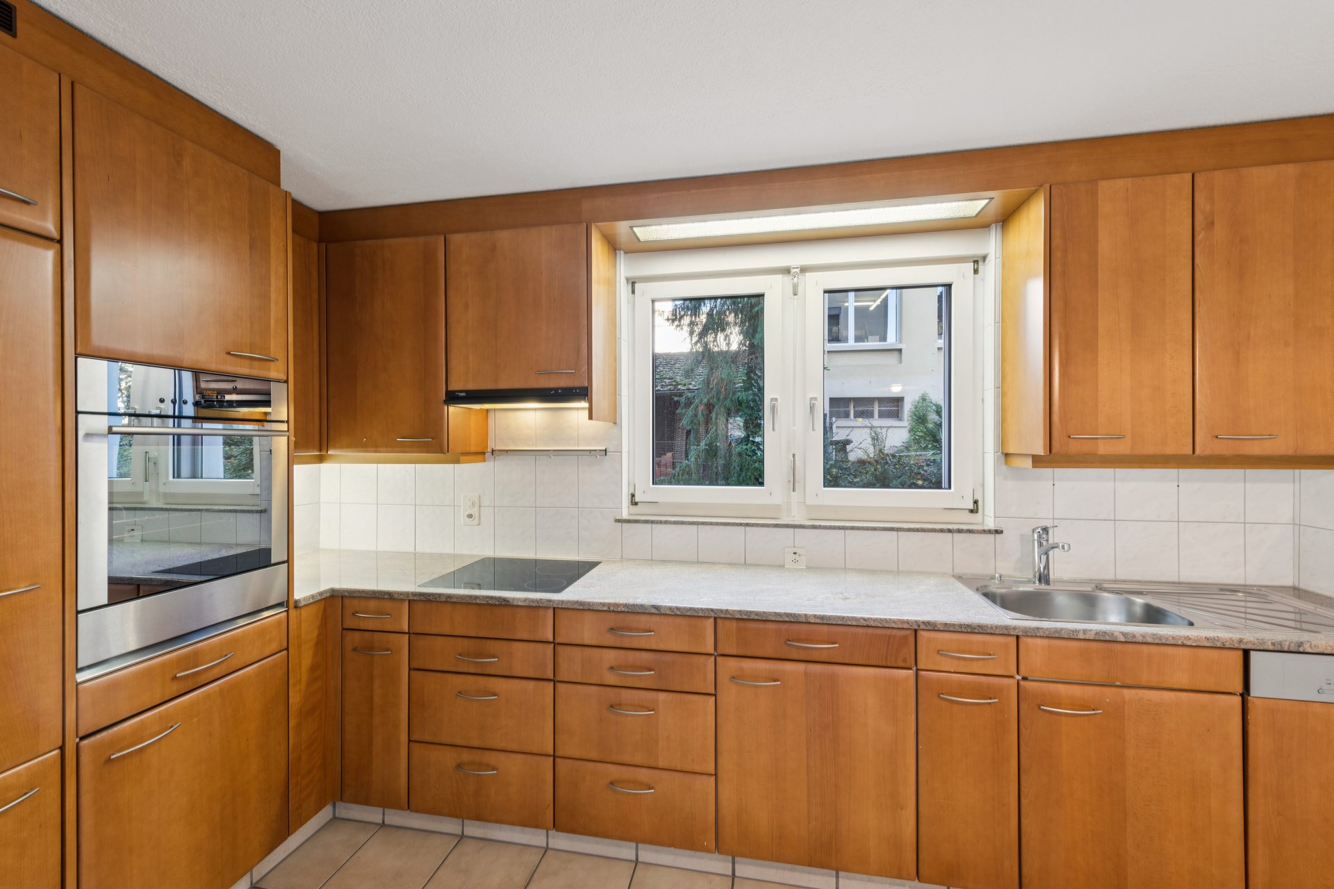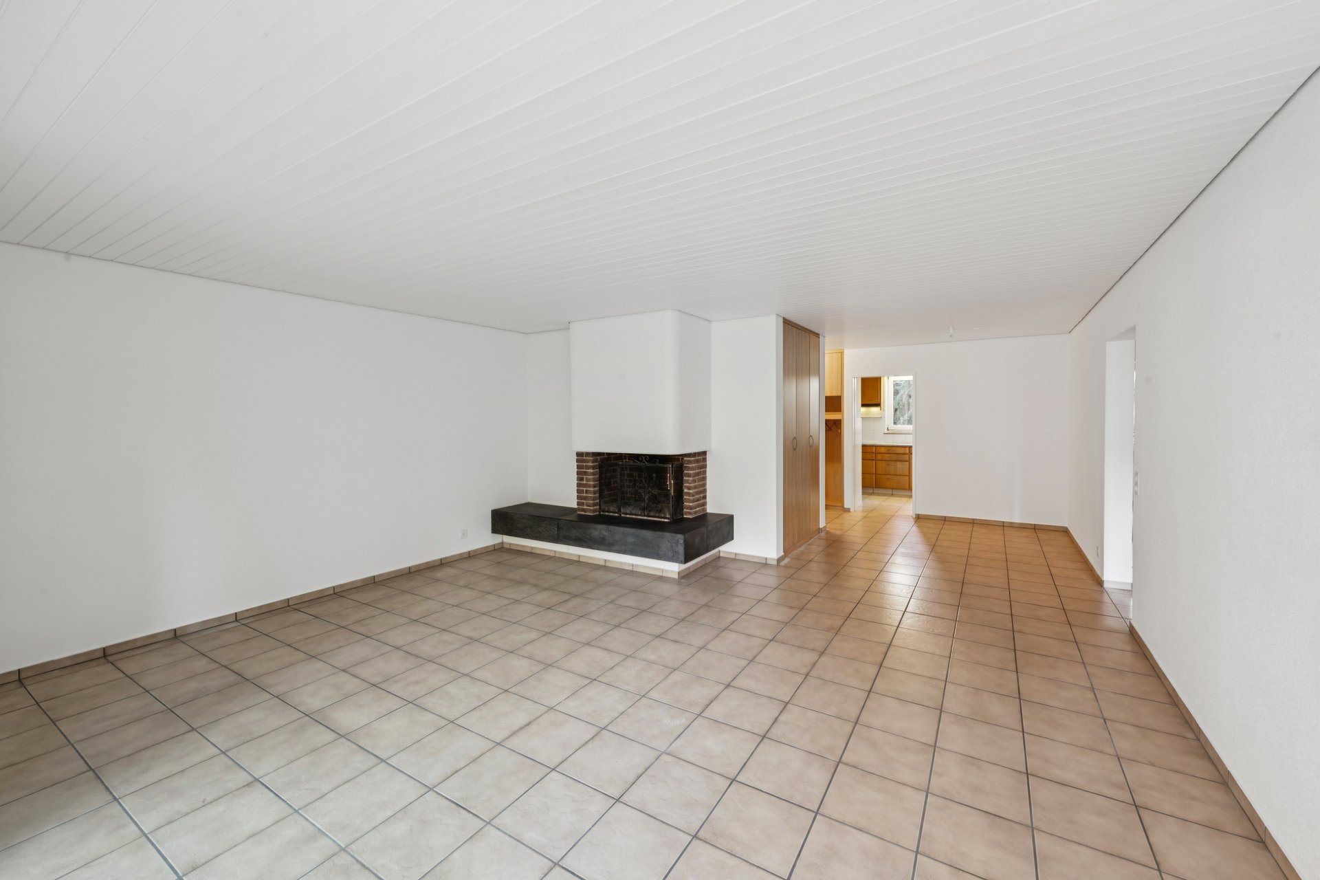 Mit dem Lift oder zu Fuss eine kurze Treppe hinauf, wird diese ansprechende, helle, gemütliche 4.5-Zimmer-Eigentumswohnung bequem erreicht. Beim Betreten des Entrées befindet sich zur linken eine integrierte Garderobe und zur rechten die Gästetoilette. Das Wohn-/Esszimmer wird bereichert durch ein stilvolles Cheminée für heimelige Winterabende und wirkt hell und luftig, dank der weissen Täferdecke.