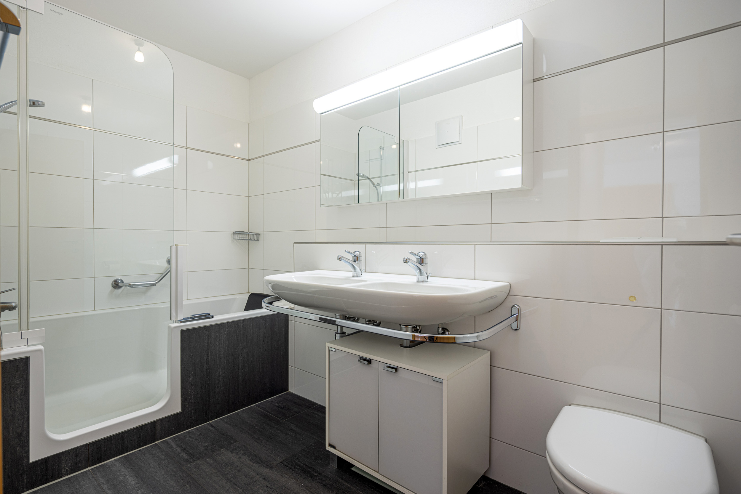 Für mehr Privatsphäre steht zudem für die Gäste ein separates WC bereit. Im Untergeschoss stehen ein eigener Keller mit Waschküche und ein Disporaum zur Verfügung. Zwei Tiefgaragenplätze mit Elektroanschluss runden dieses äusserst attraktive Angebot ab.