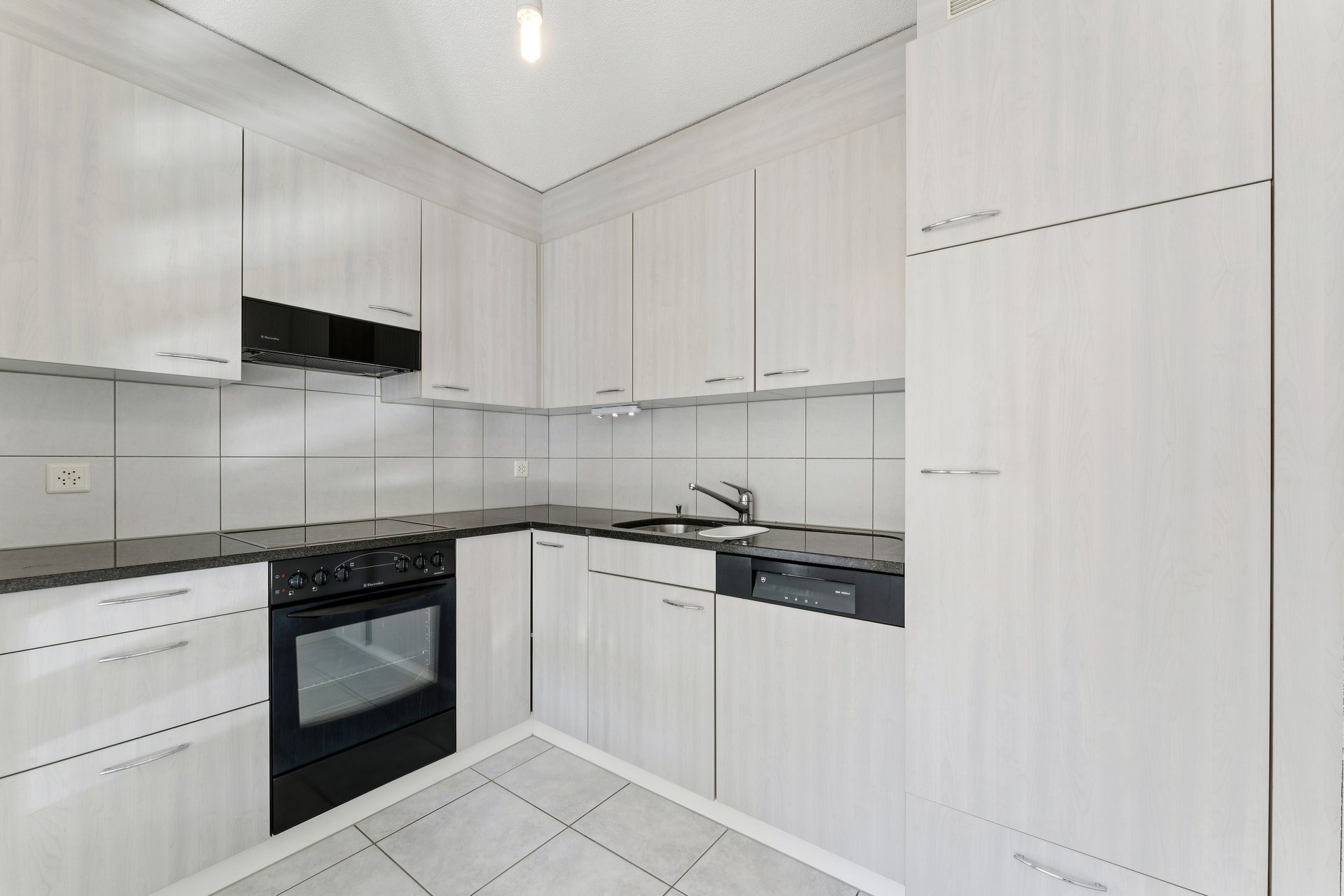 Die Küche schliesst unmittelbar an den Essbereich an. Sie ist funktional ausgestattet, bietet genügend Stauraum und lässt sich bei Bedarf mit einer Schiebetür vom Wohnraum abtrennen.