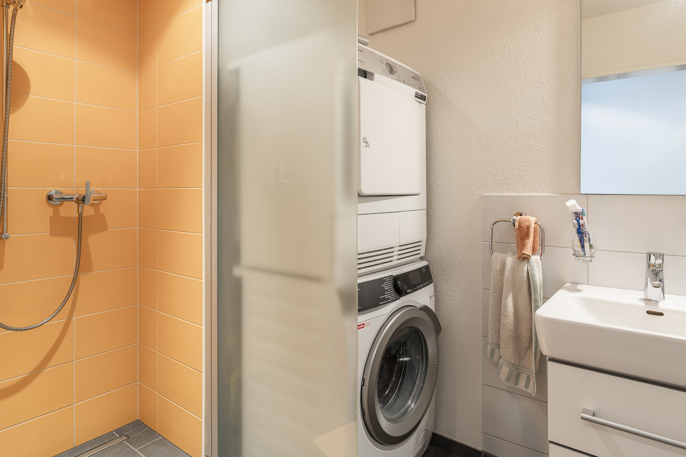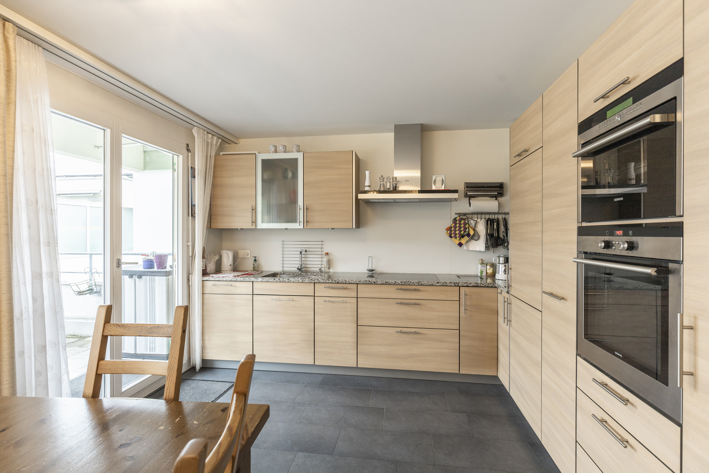 Die Wohnung verfügt über eine geräumige, moderne Küche, ein helles Hauptschlafzimmer mit zwei Fensterfronten sowie zwei Badezimmer: eines en Suite mit grosser Badewanne und ein weiteres mit Dusche, WC und praktischem Waschturm. Die Attika-Lage und die zwei umfangreichen Terrassen sorgen für Privatsphäre und ein besonderes Wohngefühl.