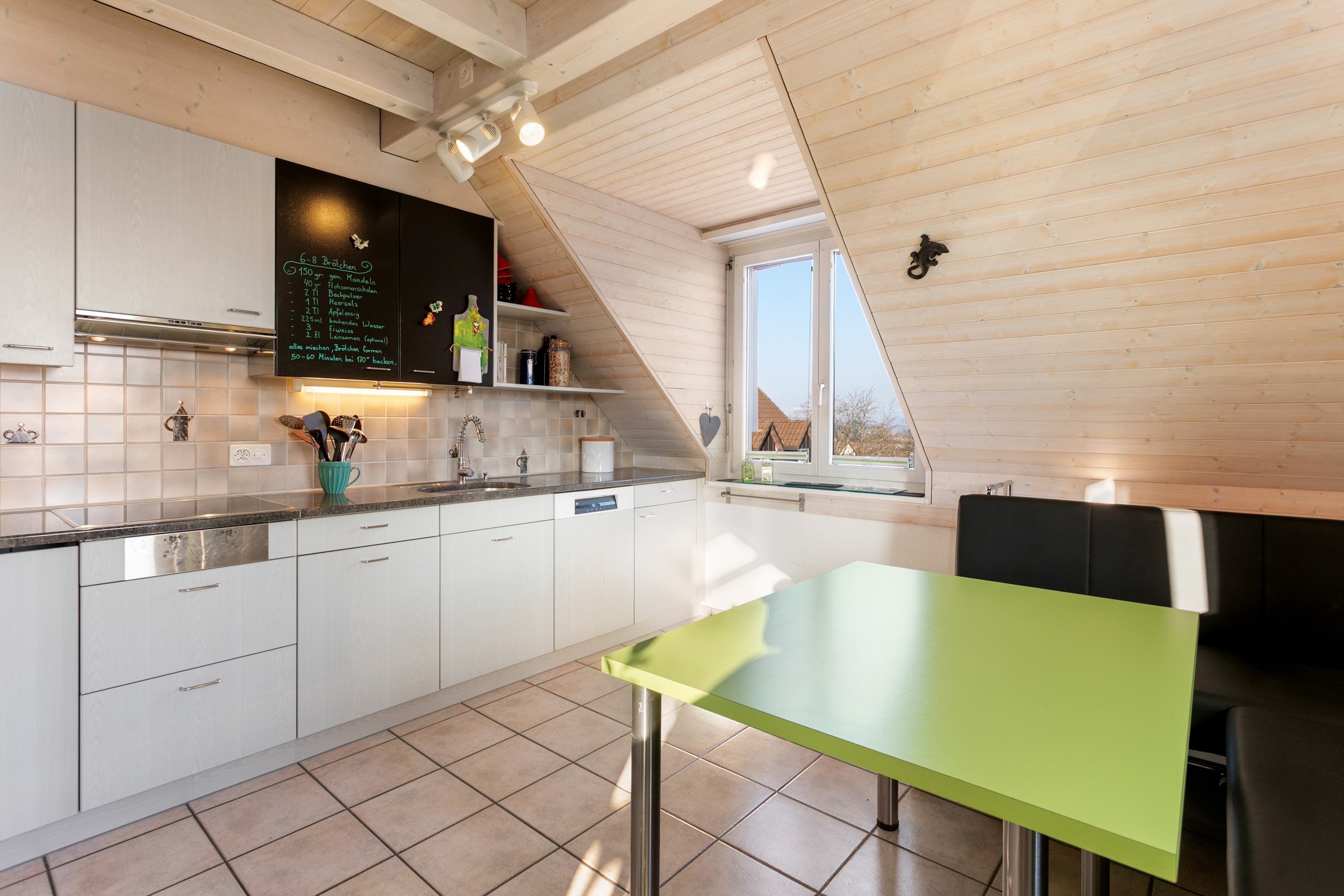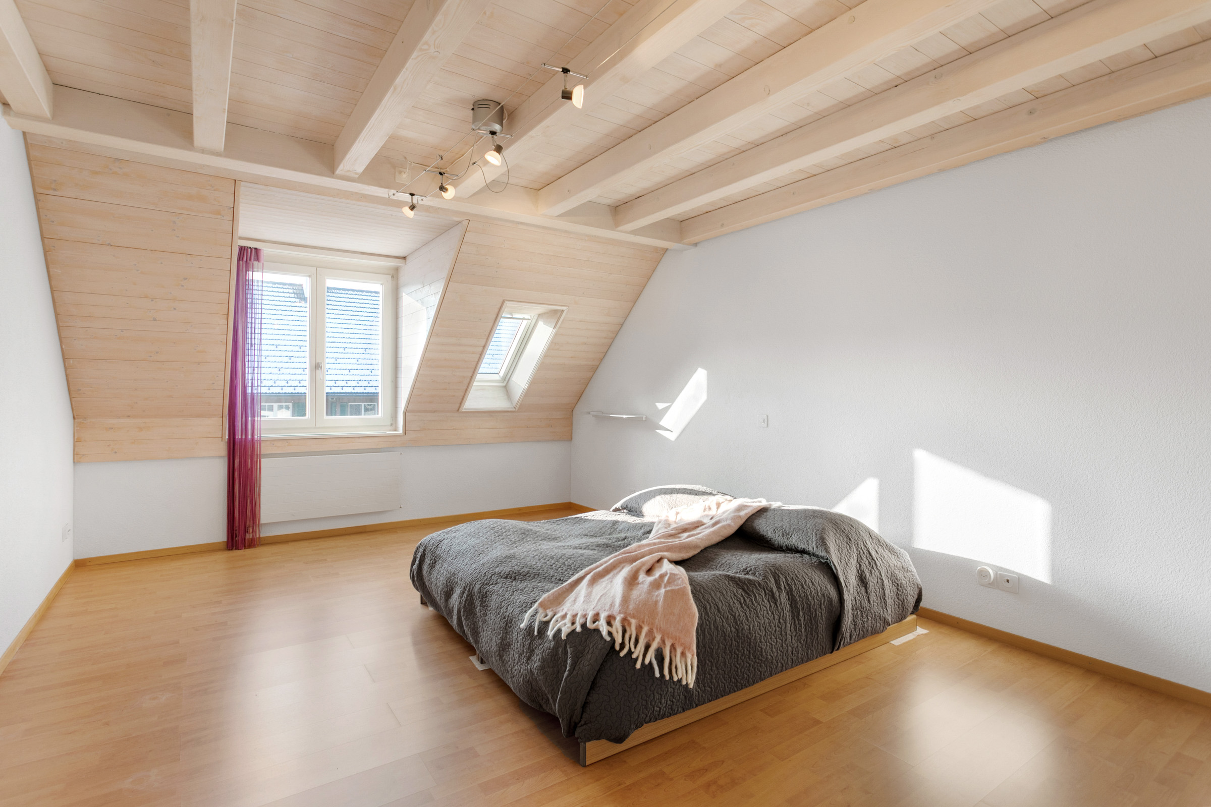 Die elegante Treppe führt Sie in das Dachgeschoss, das mit seinen stilvollen Schrägen ein besonderes Wohnambiente schafft. Der geräumige Vorraum lässt sich ideal als Büro, Atelier oder zusätzliche Wohnzone nutzen und bietet viel Raum für persönliche Gestaltung. Ein weiteres umfangreiches Zimmer unter dem Dach ermöglicht vielfältige Nutzungsmöglichkeiten. Mit einem zusätzlichen Heizelement kann der ausgebaute Estrich als fünftes Zimmer genutzt werden.