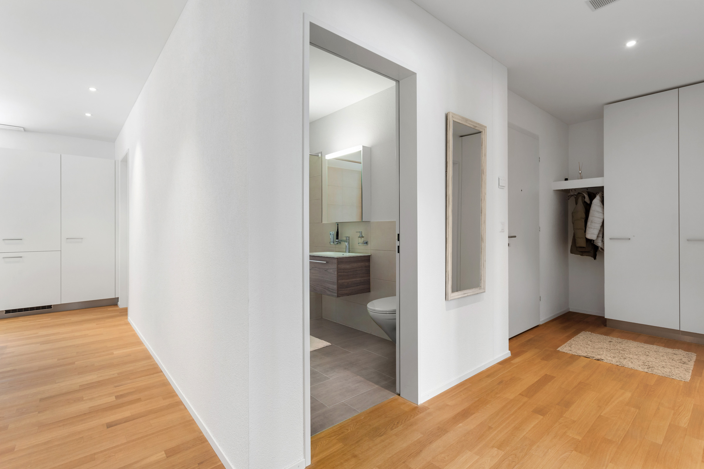 Vom Lift gelangen Sie direkt in das grosszügige Entrée mit praktischen Einbauschränken. Das geräumige Schlafzimmer verfügt über ein Bad en suite mit begehbarer Dusche, das für besonderen Komfort und Privatsphäre sorgt. Ein separates Gästebad mit Badewanne und die zwei zusätzlichen Zimmer ergänzen das Raumprogramm.