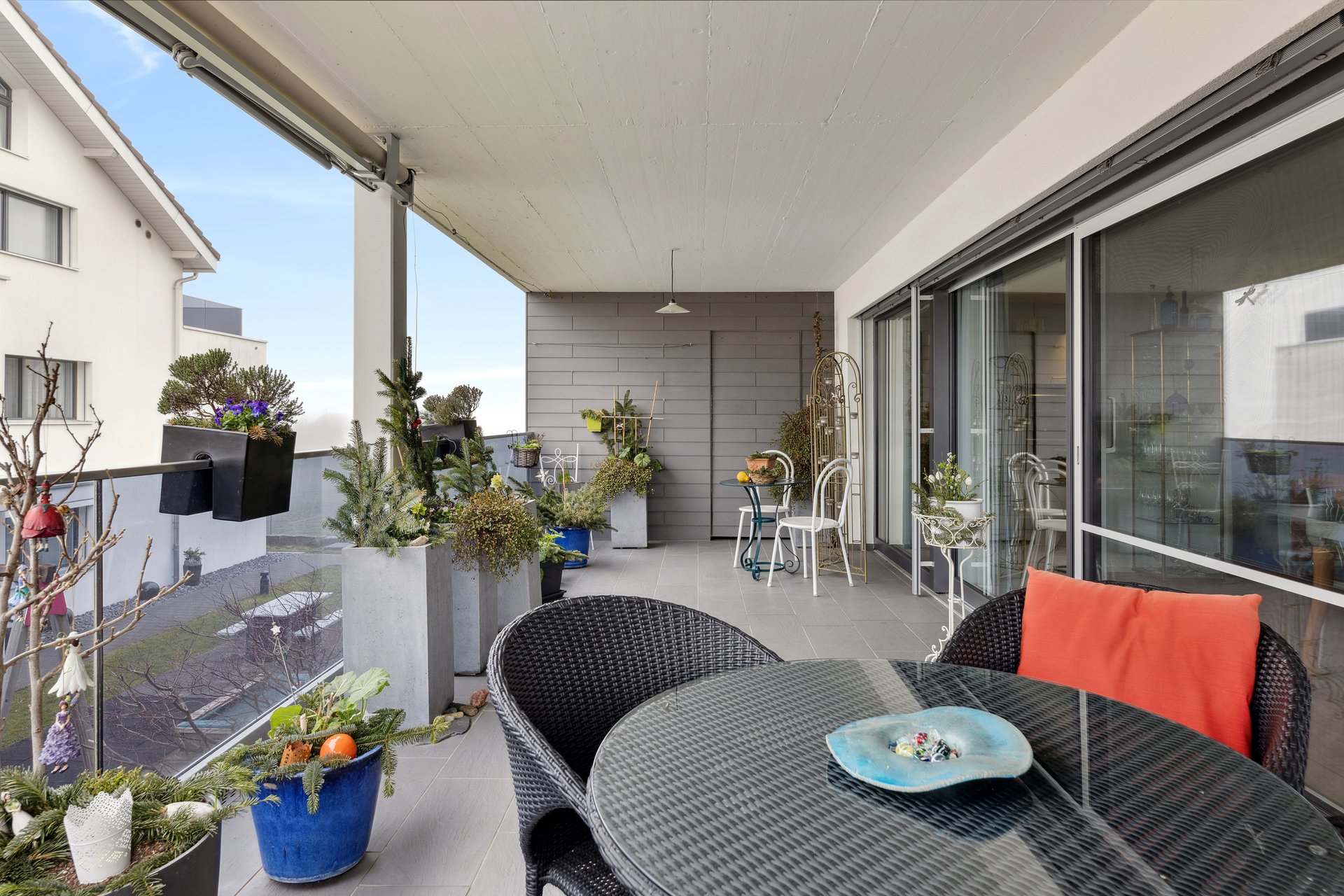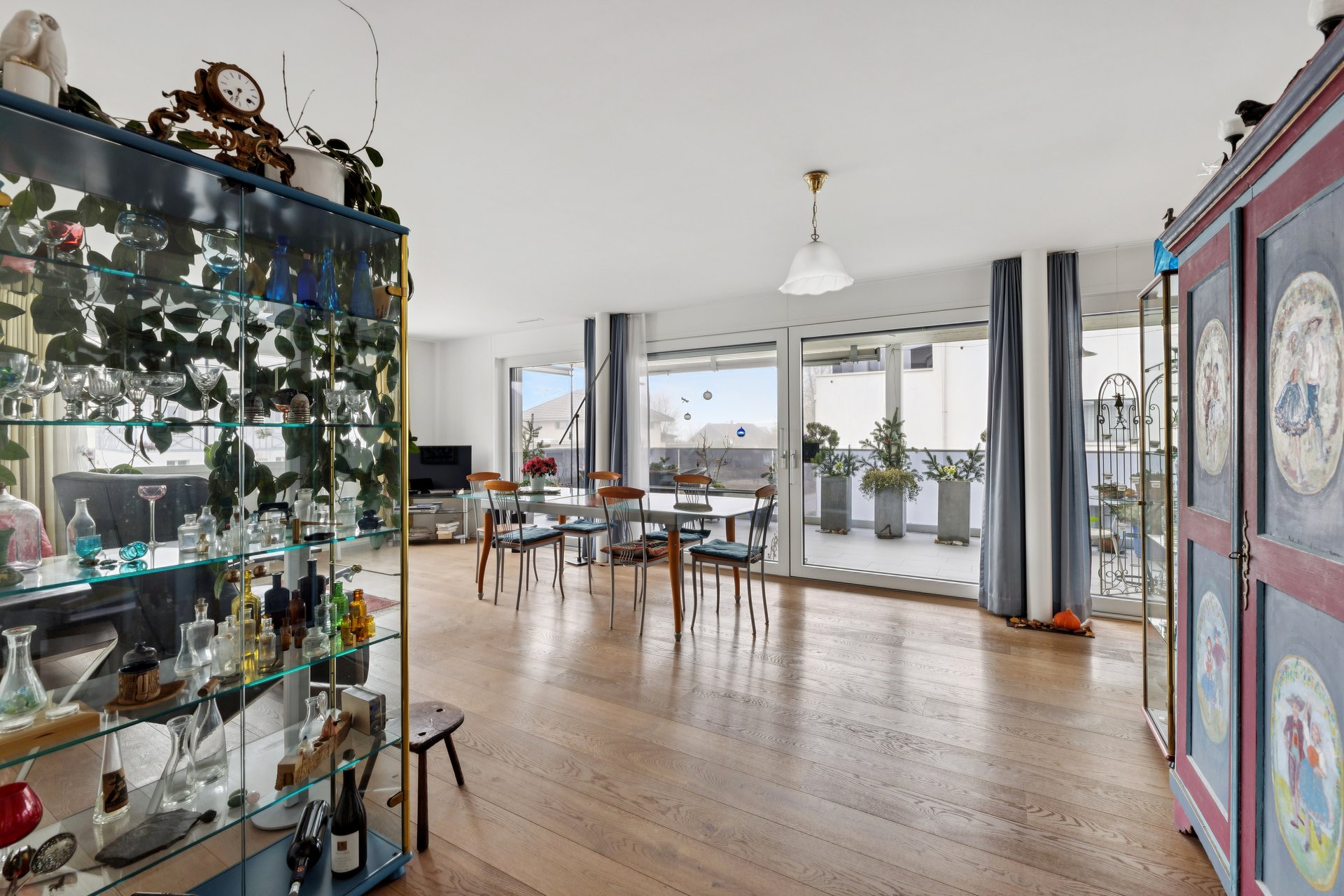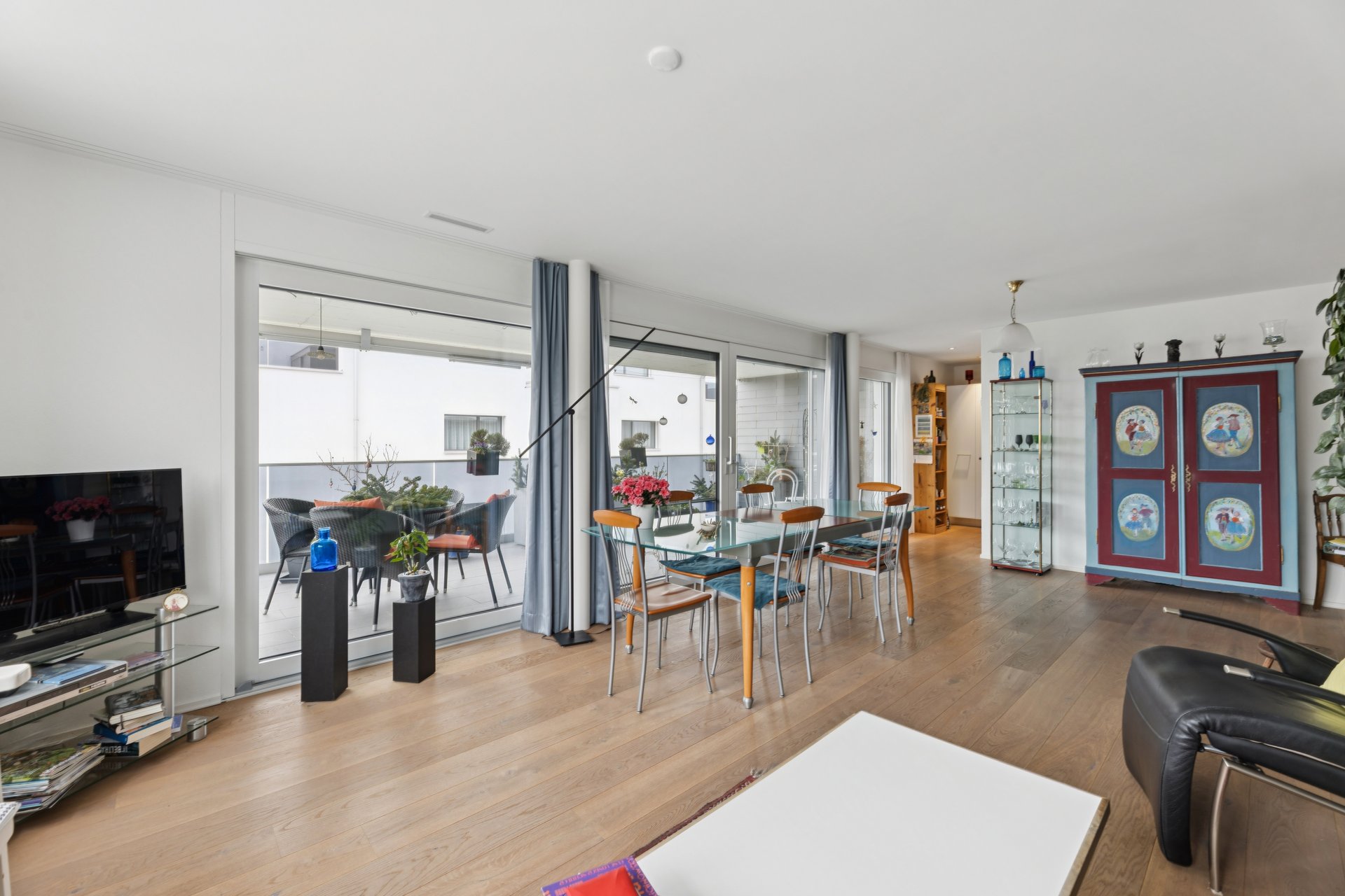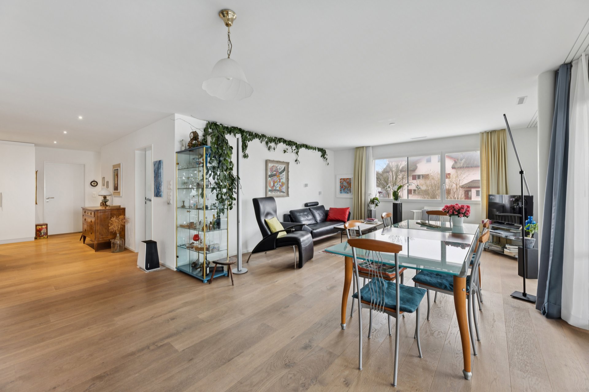 Der Korridor öffnet sich zum Herzstück der Wohnung: dem lichtdurchfluteten Wohn- und Essbereich. Umfangreiche Fensterflächen lassen viel Tageslicht herein und bringen den hochwertigen Eichenparkett besonders zur Geltung. Von hier aus gelangen Sie auf den rund 26 m² grossen Südwestbalkon. Ob gemütlicher Apéro bei Sonnenuntergang, entspanntes Wochenende mit Freunden oder ruhige Momente für sich – dieser Aussenbereich schafft zusätzlichen Wohnraum im Freien.