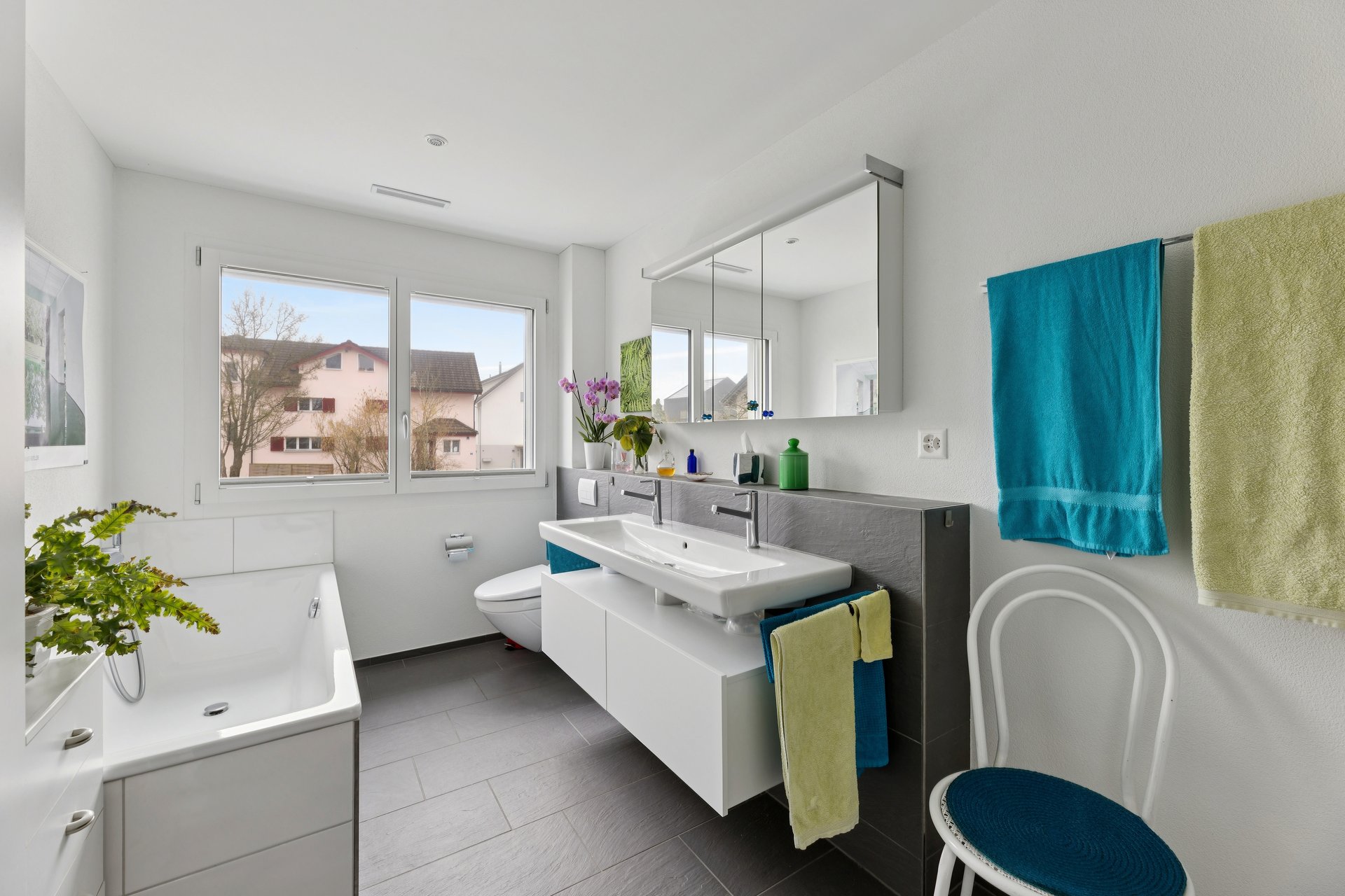 Auf der ersten Etage erwartet Sie die grosszügige 4.5 Zimmer Wohnung mit 119 m² Wohnfläche, die durch Helligkeit und eine warme Atmosphäre überzeugt. Bereits das Entrée vermittelt mit dem Einbauschrank Ordnung und Stil. Links befinden sich zwei helle Zimmer sowie gleich angrenzend das einladende Badezimmer mit Badewanne, Dusche, Doppellavabo und Fenster. Die hochwertigen, modernen Platten verleihen dem Raum eine zeitlose Eleganz.