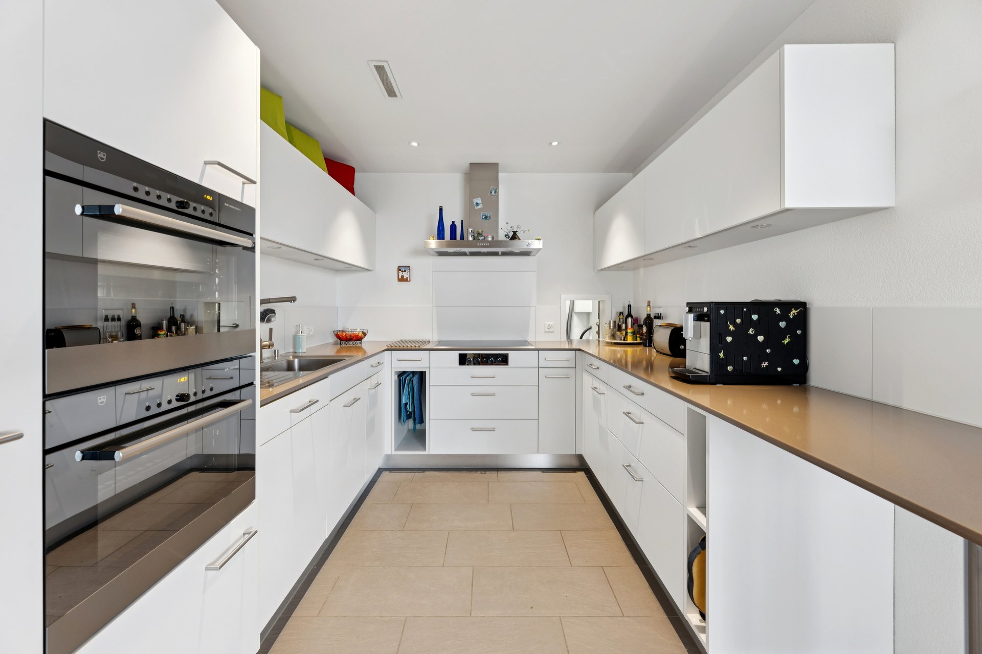 Die moderne Küche fügt sich harmonisch an den Essbereich an und überzeugt durch viel Arbeitsfläche, Stauraum und eine funktionale Gestaltung. Besonders clever gelöst ist die Durchreiche ins Reduit.