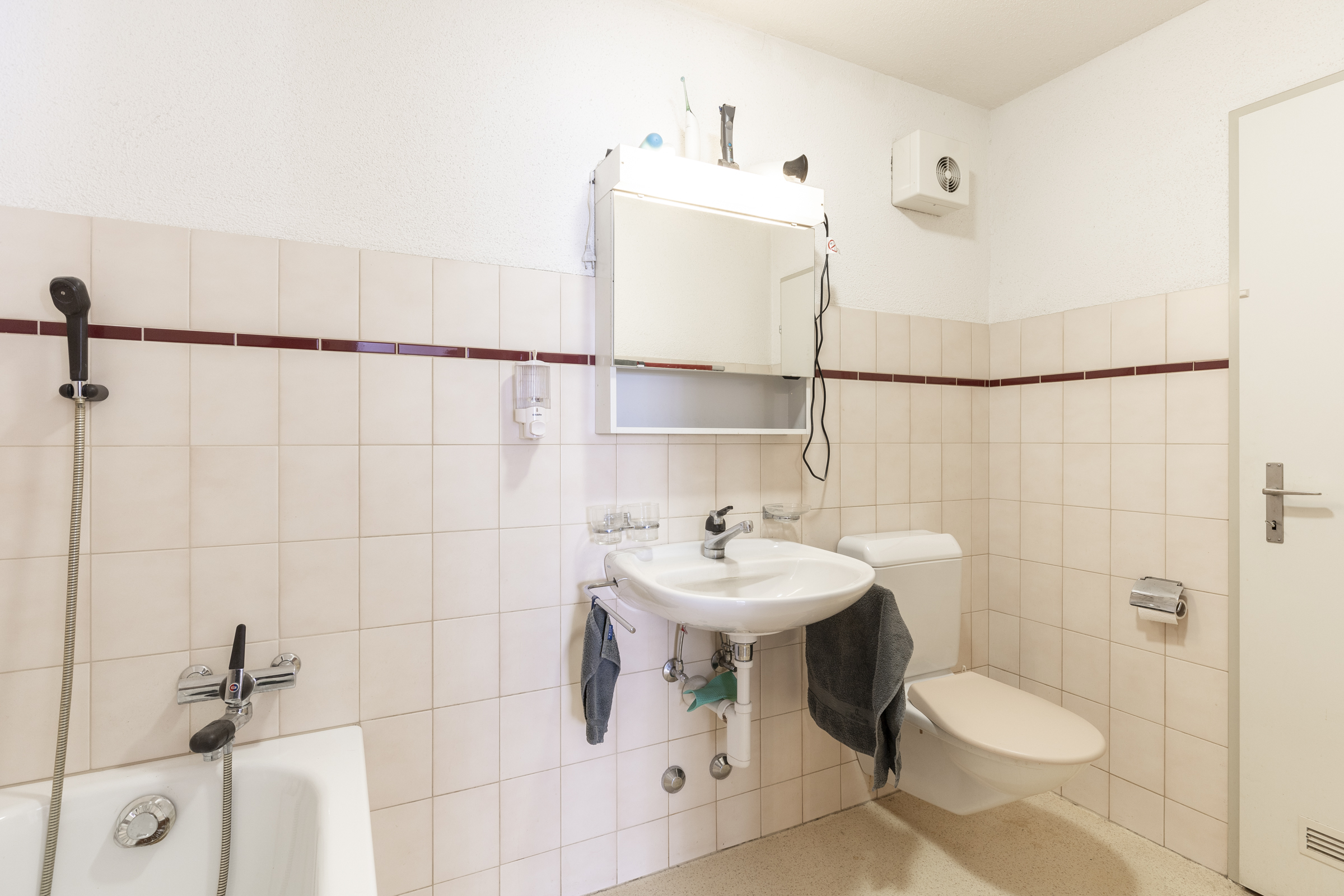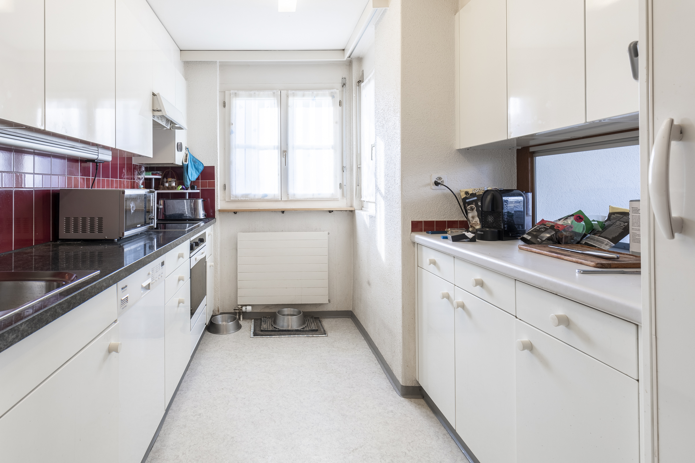 Die Wohnung verfügt über mehrere Nasszellen – ein Badezimmer sowie eine separate Dusche/WC – was den Wohnkomfort für Familien oder Paare zusätzlich erhöht. Die bestehende Küche verfügt über genügend Raum für neue Konzepte und kann zu einem zentralen Treffpunkt umgestaltet werden.
