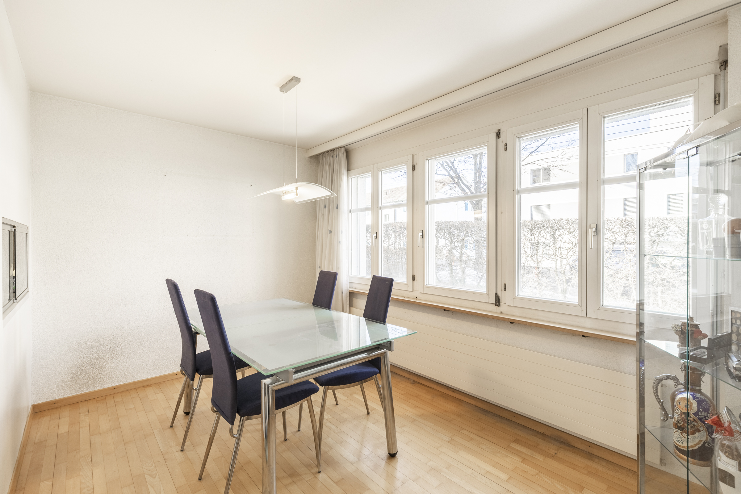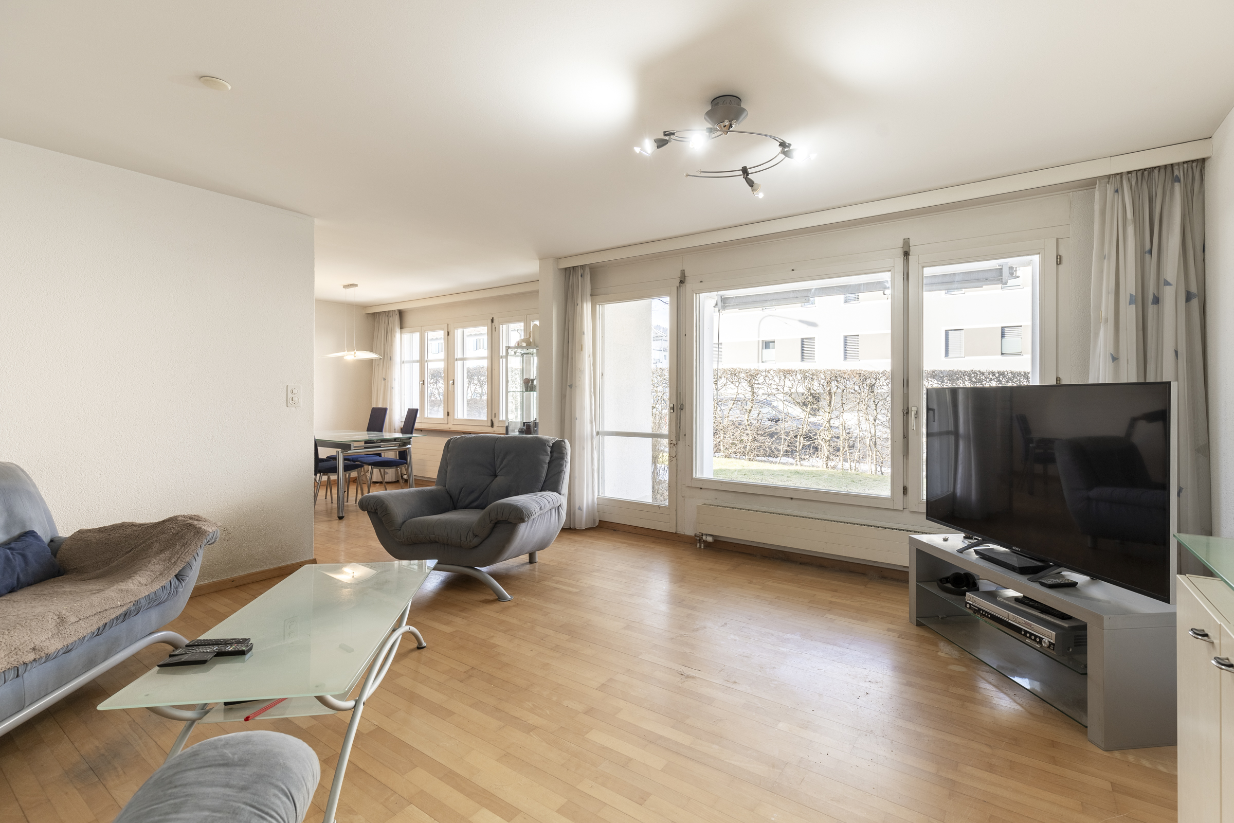 Beim Betreten der 4.5-Zimmer-Erdgeschosswohnung fällt sofort der grosszügige Grundriss auf, der viel Potenzial für individuelle Wohnideen bietet. Die Räume sind hell, freundlich und lassen sich nach einer Sanierung wunderbar zu einem modernen und gemütlichen Zuhause gestalten. Das ansprechende Entrée mit Platz für eine Garderobe führt Sie in die verschiedenen Wohnbereiche, die aufgrund ihrer Grösse vielseitige Nutzungsmöglichkeiten eröffnen.