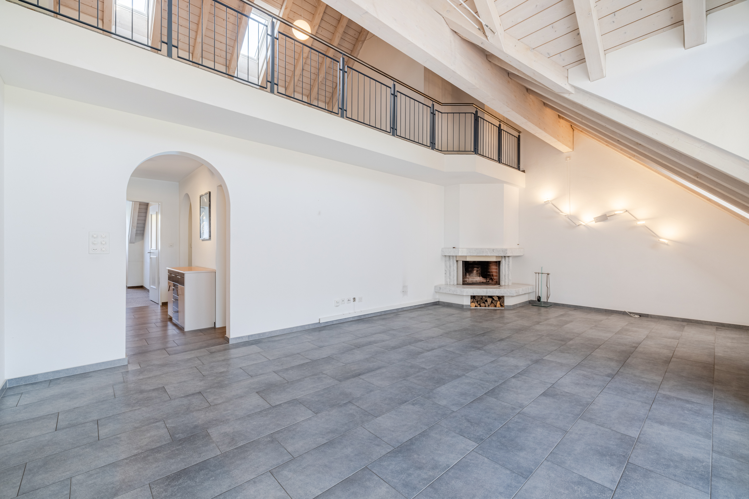 Ein weiterer Pluspunkt dieser Wohnung ist die grossflächige Dachgalerie, die über die elegante Wendeltreppe zugänglich ist. Sie ist vielfältig nutzbar, sei es als Bibliothek, Homeoffice, Fitnessraum oder Heimkino – Sie haben die Wahl!