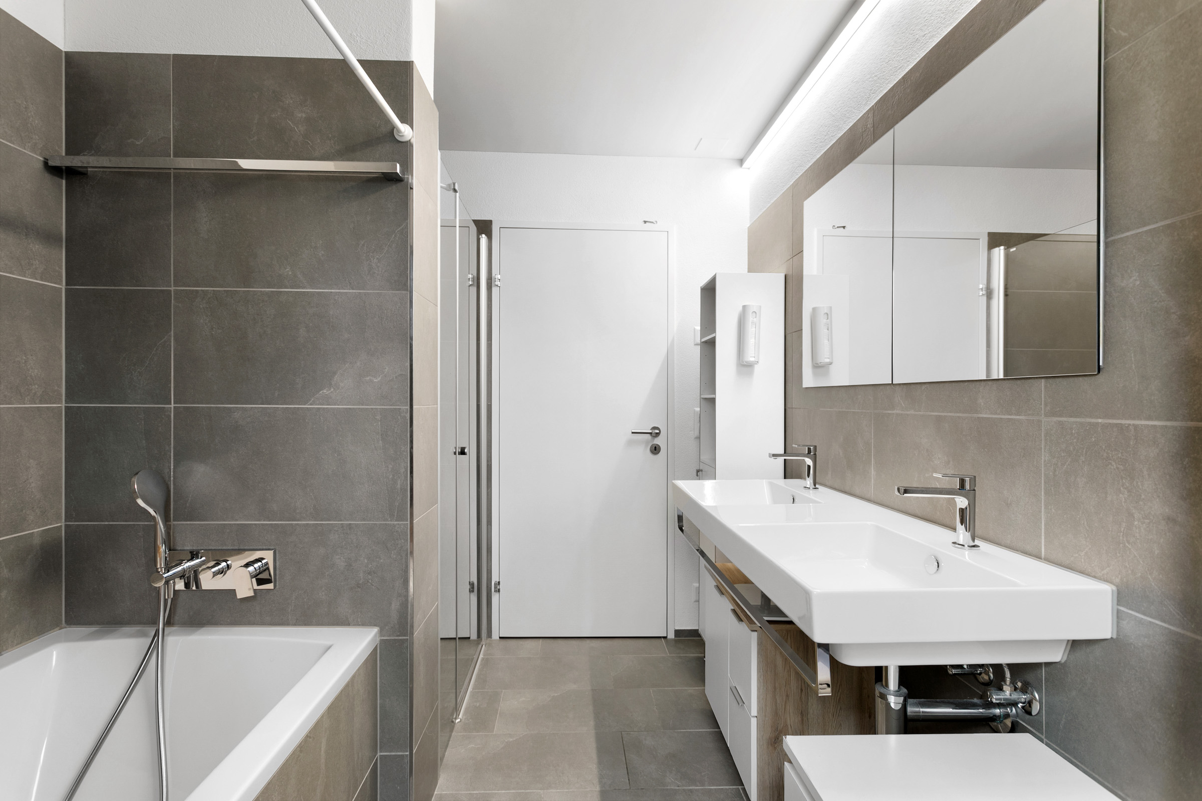 Die Zimmer sind grosszügig geschnitten und lassen sich flexibel als Schlaf-, Kinder- oder Arbeitszimmer nutzen. Zwei komfortable Badezimmer stehen zur Verfügung: ein Familienbad mit Dusche und Badewanne sowie ein weiteres Badezimmer mit integriertem Wasch- und Trocknungsturm.