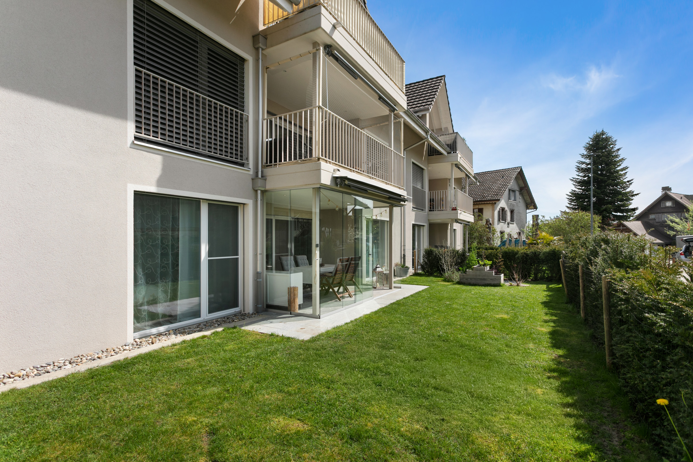 Vom Wohnbereich aus gelangen Sie auf die verglaste Terrasse, die sich bei jedem Wetter als geschützter Ort zum Entspannen anbietet. Die Wohnung ist vollständig von einer Rasenfläche umgeben, die im Sondernutzungsrecht steht und zusätzlichen privaten Freiraum schafft.