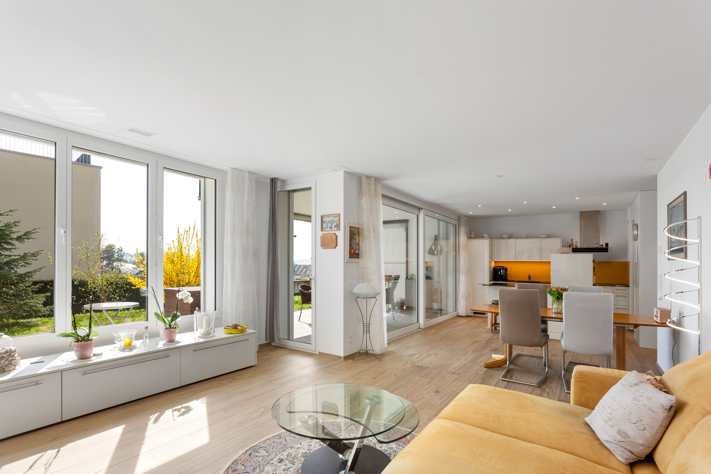 Vom Wohnzimmer aus gelangen Sie auf den wunderbaren gedeckten Gartensitzplatz sowie in den angrenzenden Garten zur alleinigen Nutzung. Die optimale Ausrichtung sorgt für angenehme Morgen- und Mittagssonne. Zwischen den vorgelagerten Gebäuden eröffnet sich bei klarer Sicht ein herrlicher Blick in die Berge – ein besonderes Detail, das den Aussenbereich zusätzlich aufwertet.