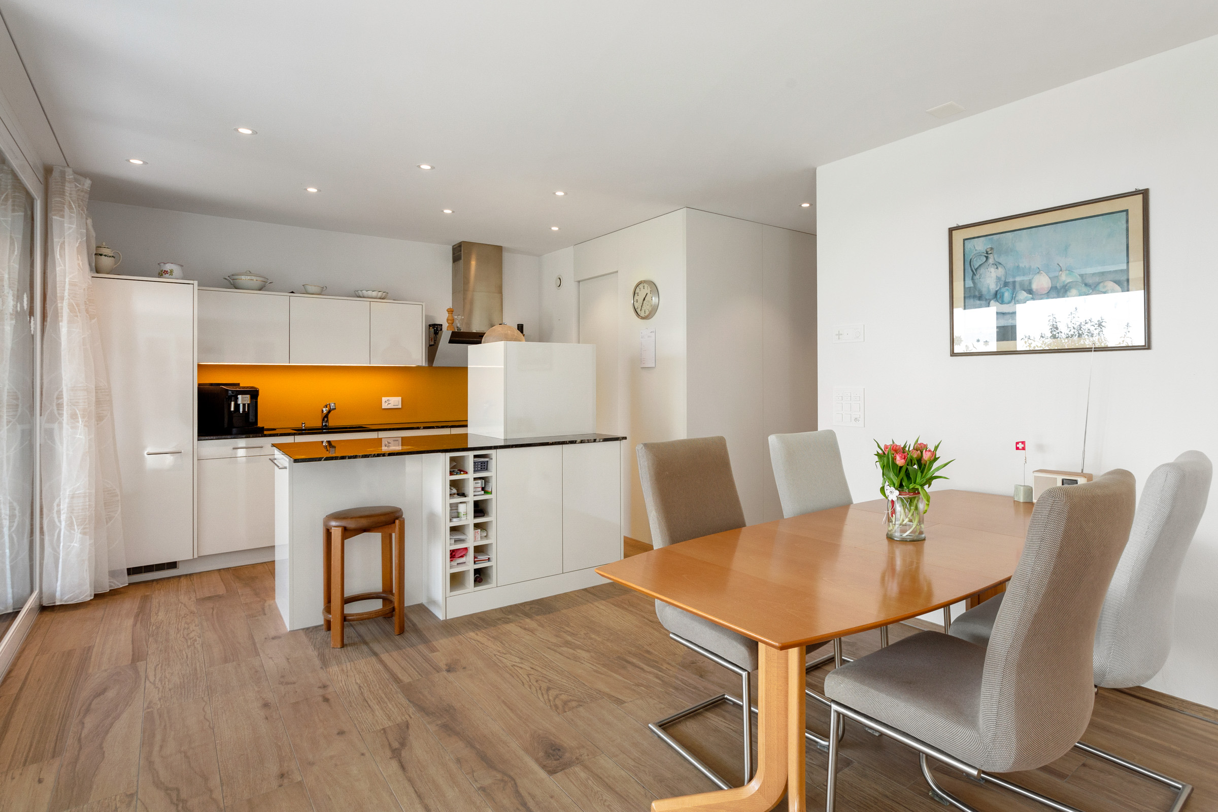 Das Herzstück der Wohnung bildet der offen gestaltete Wohn- und Essbereich. Grosse Fensterflächen lassen viel Tageslicht herein und schaffen eine freundliche Atmosphäre. Die moderne offene Küche verfügt über eine Kochinsel, während das praktische Reduit zusätzlichen Stauraum für Vorräte und Alltagsutensilien bereithält.